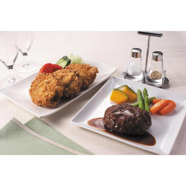国産野菜(じゃがいも・たまねぎ)、黒毛和牛を使用したサクサク衣のコロッケと、国産肉(牛肉・豚肉)・国産玉葱を使用し、肉の旨味を引き出すため調味料、香辛料などは控えめにし、あくまで素材の旨味を大切にしたハンバーグのセットです。自慢の特製デミグラスソースと共にお召し上がりください。