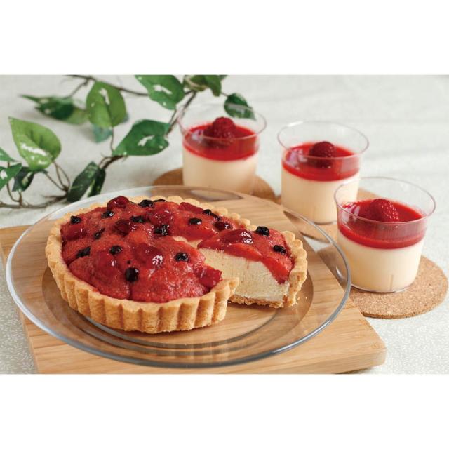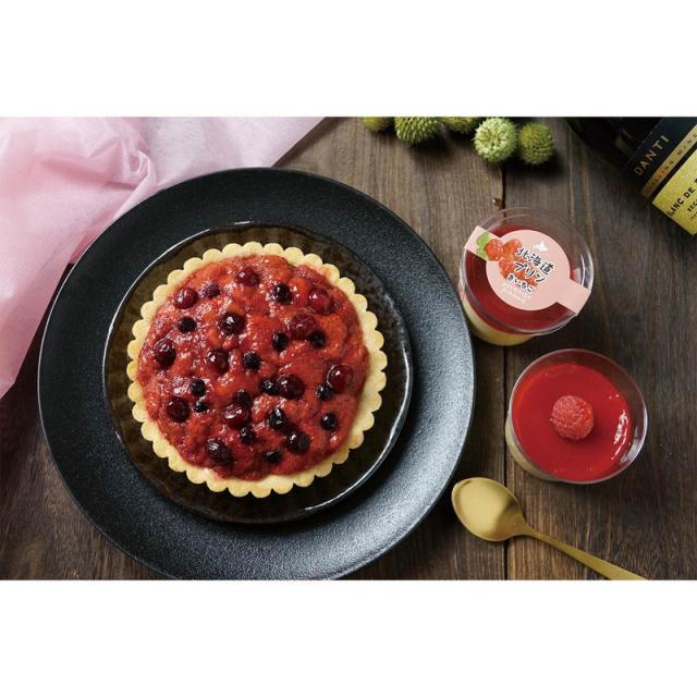 北海道産クリームチーズを使用しストロベリーなどの甘酸っぱいベリーを乗せたタルトケーキと北海道産の牛乳を使用したプリンに「木苺ソース」をかけたプリン。