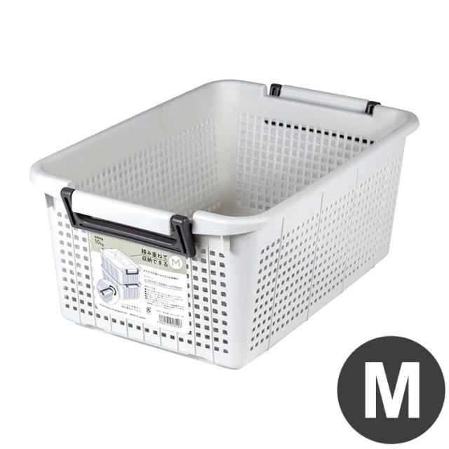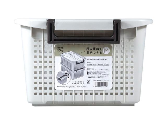 積み重ねできる収納バスケットM(深型)サイズ。取っ手を内側に倒すと積み重ねることができる。重ねてもズレないので安心。使わないときも重ねてまとめられ、場所をとらないので便利。