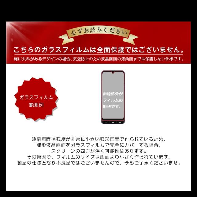 ※液晶画面は弧度が非常に小さい2.5D弧形画面で作られているため、弧形液晶画面をガラスフィルムで完全にカバーする場合、スクリーンの四方が浮く可能性はあります。その原因で、フィ ルムのサイズは画面より小さく作られています。予めご了承ください。