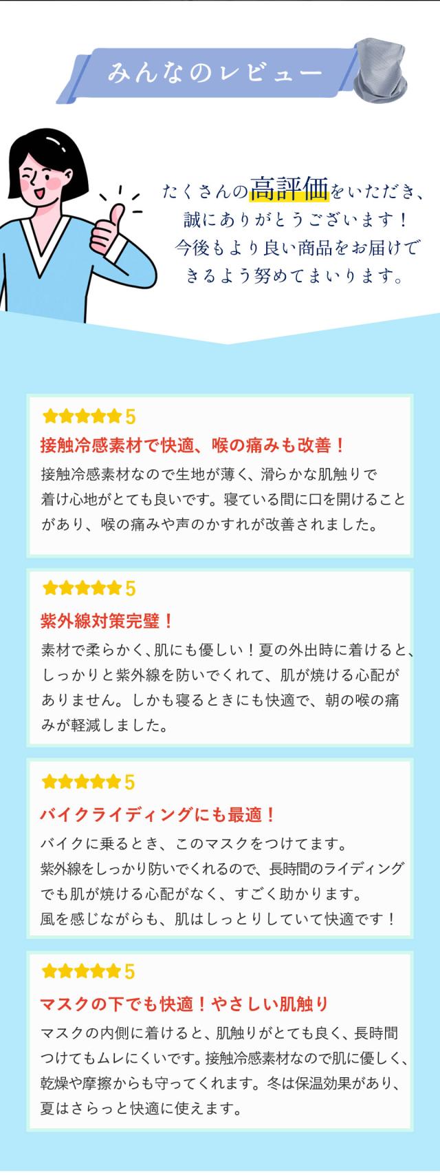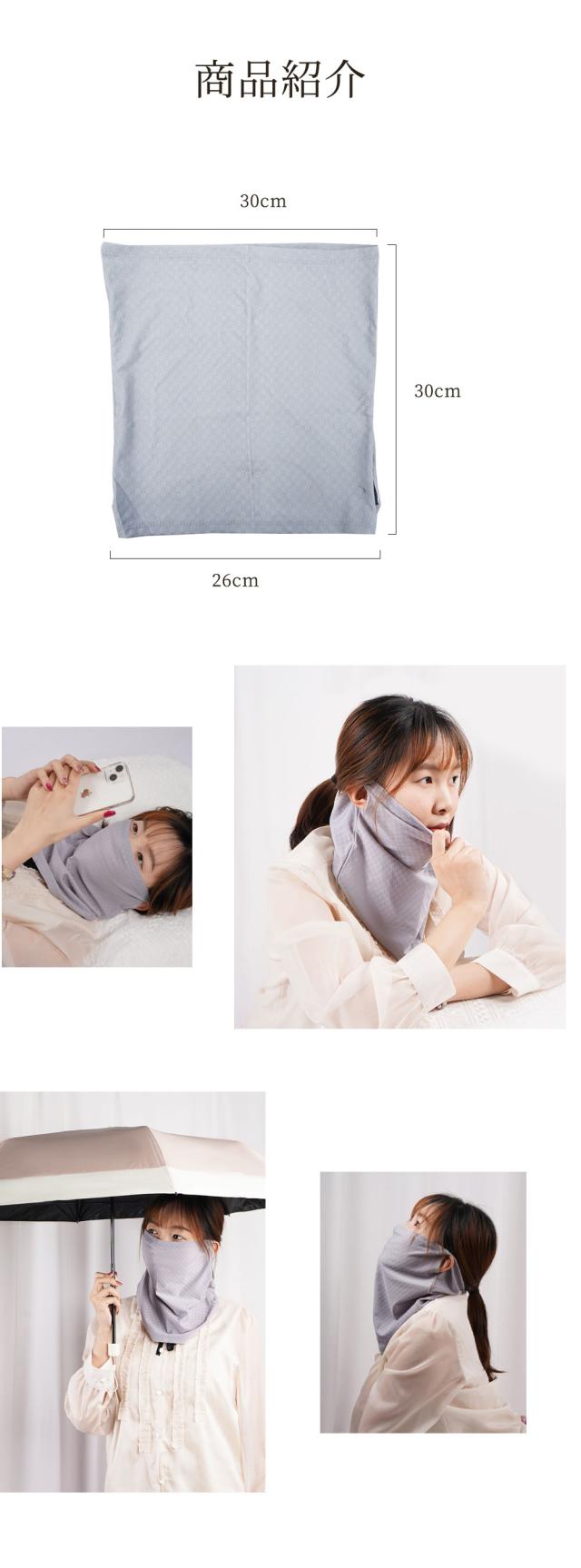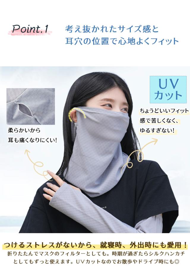 【伸縮性・耳掛けタイプ・息苦しくない】伸縮性のある生地を使用していますので、耳に引っ掛けるのでズレずに激しい動きも大丈夫です。長時間着用しても耳が痛くなりません。弾性変形を有しており、ネックカバーやヘッドバンドとしても使えます。使い捨て商品よりもエコで経済的、効果が長く続くので当社のネックガードは安心して使えます。蒸れや暑さを抑える風通しの良い冷感繊維であるため、水や汗で濡れると気化熱の作用により冷却効果で温度が3℃〜5℃下がり、暑さ対策としても効果的です。夏のお出かけには不可欠なアイテムです。