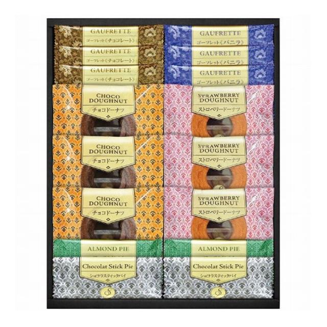 風味豊かなバニラクリームをサンドしたバニラゴーフレットや、上品な味わいに仕上げたチョコゴーフレット、何層にも重ねたパイ生地に細かく砕いたアーモンドを挟み、サックリと焼き上げたアーモンドパイ、チョコをサンドしたやさしい甘さのショコラスティックパイに、チョコとストロベリーの焼ドーナツをセットしました。お菓子好きな人にも満足な詰合せです。