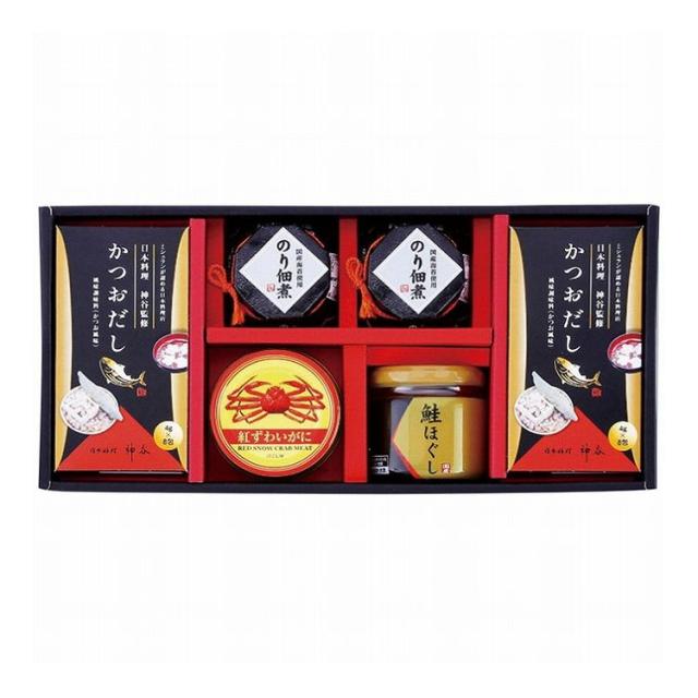現品サイズ・内容:かつおだし(4g×8袋)2個・鮭ほぐし50g×1瓶・のり佃煮80g×2瓶・紅ずわいがにほぐし身55g×1缶