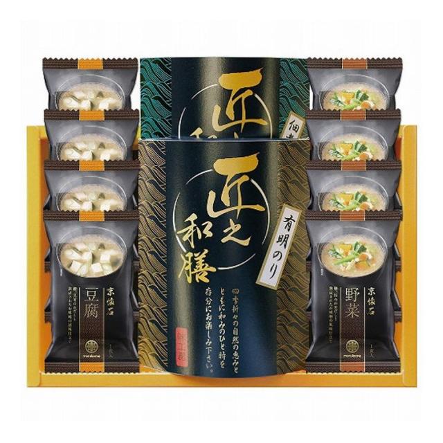現品サイズ・内容:マルコメ京懐石お味噌汁フリーズドライ(豆腐・野菜各4個)・有明のり(12切5枚6袋)・佃煮(ごま昆布)40g各1個