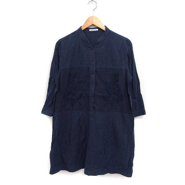 【中古】シンプルライフ SIMPLE LIFE シャツ ワンピース 7分袖 ひざ丈 切替 刺繍 コットン 綿 L ネイビー 紺 /FT43