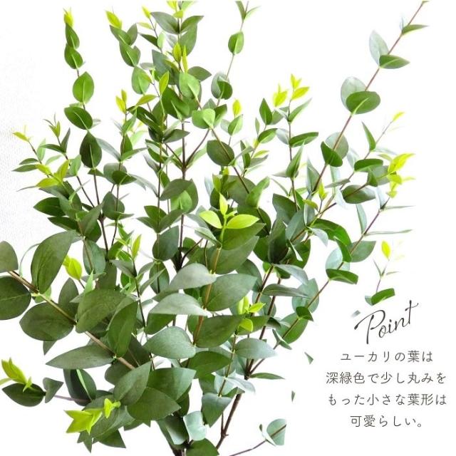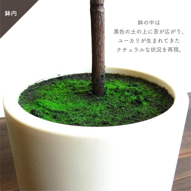 ユーカリの葉は深緑色で少し丸みをもった小さな葉形は可愛らしい。少し頼りなさげに長く伸びていく幹に、ツリー上部で枝分かれするスッキリとしたデザインでリアルな質感を再現。