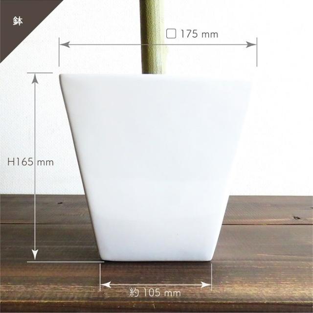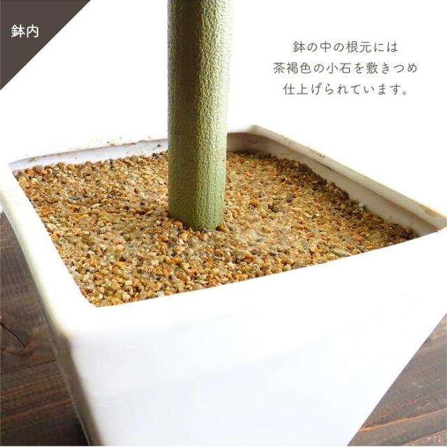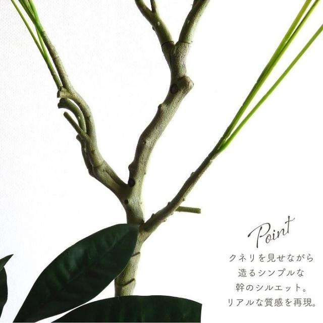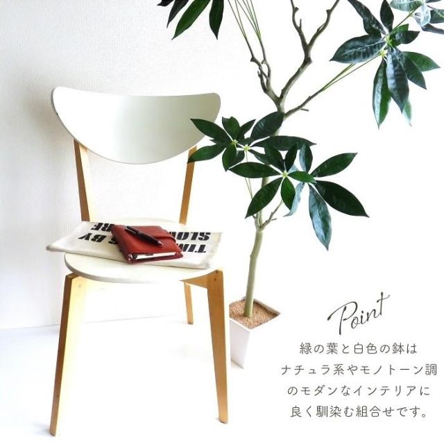複数の幹からなる葉のボリューム、陽を浴び光沢のある葉、自然の美しさを感じる。クネリを見せながら造るシンプルな幹のシルエット。リアルな質感を再現。 緑の葉と白色の鉢はナチュラ系やモノトーン調のモダンなインテリアに良く馴染む組合せです。