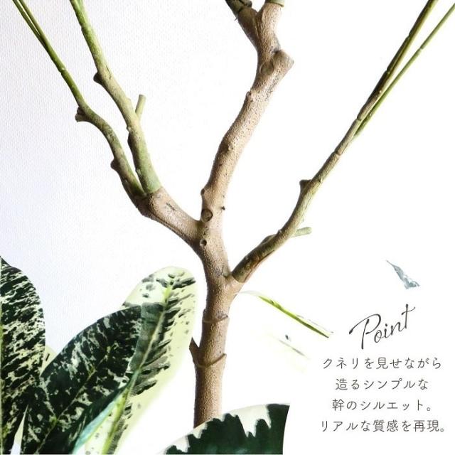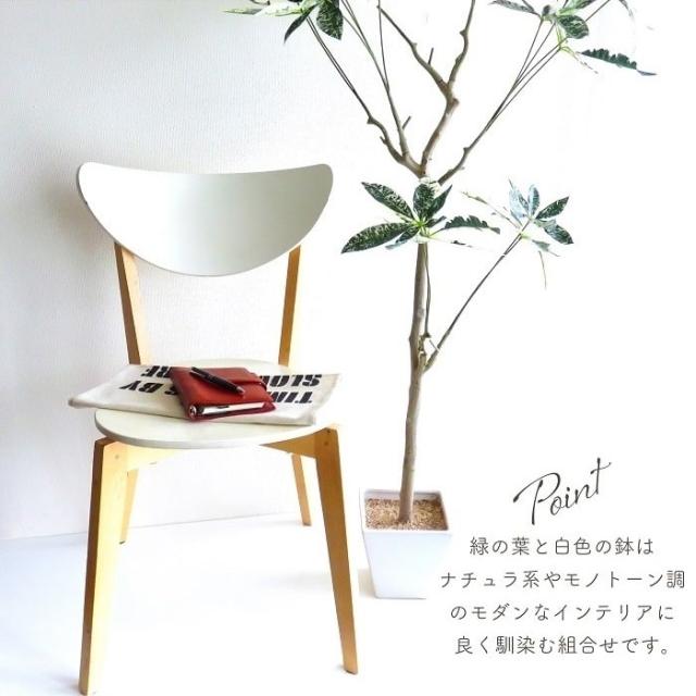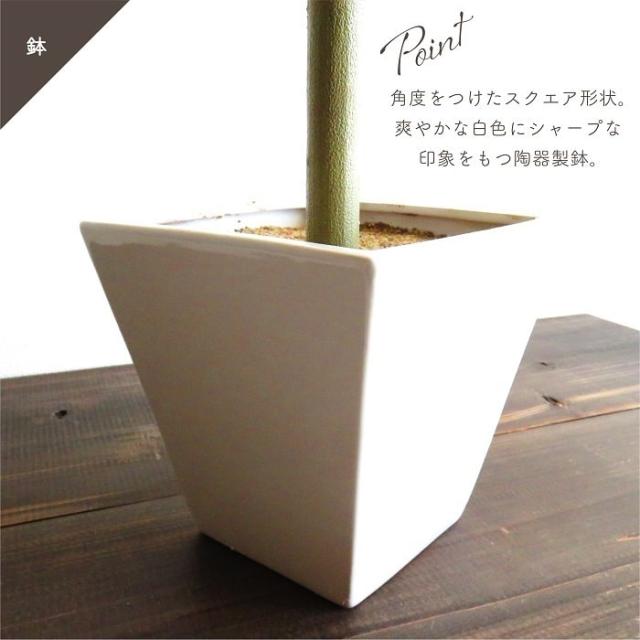 複数の幹からなる葉のボリューム、陽を浴び光沢のある葉、自然の美しさを感じる。クネリを見せながら造るシンプルな幹のシルエット。リアルな質感を再現。 緑の葉と白色の鉢はナチュラ系やモノトーン調のモダンなインテリアに良く馴染む組合せです。