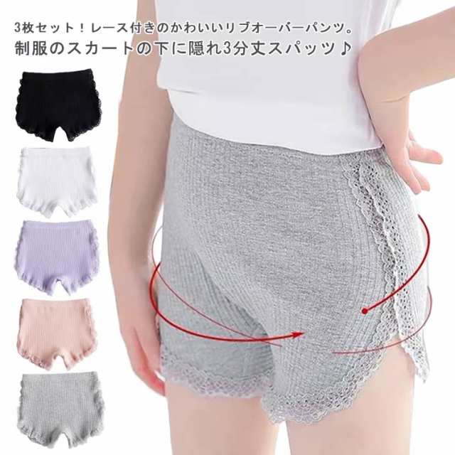 オーバーパンツ 3分丈 スパッツ 3枚組 1分丈スパッツ アンダーパンツ 綿 女の子 キッズ ジュニア リブ ショートパンツ ペチパンツ ペチコート 通学 通園 学生 制服 スカート 安全ショーツ 下着 レース フリル 裾 快適 ストレッチ 涼感 インナーパンツ 春 夏 110-160cm