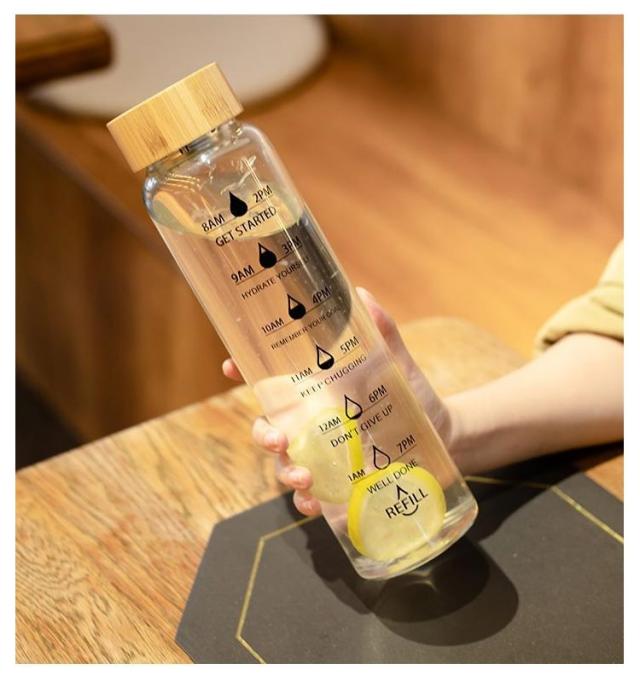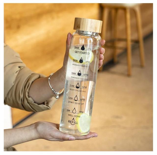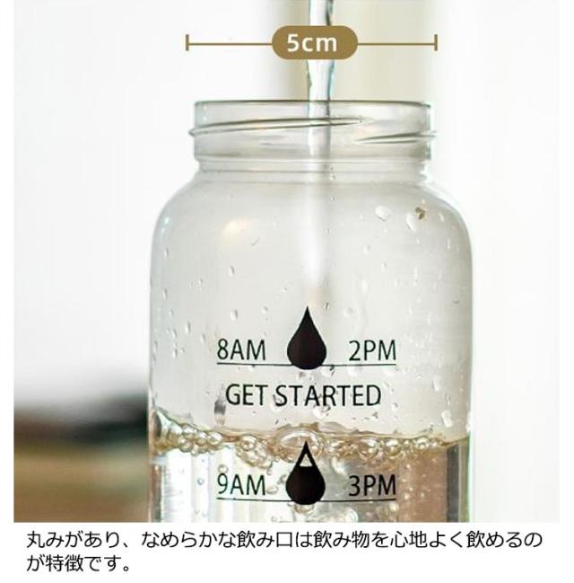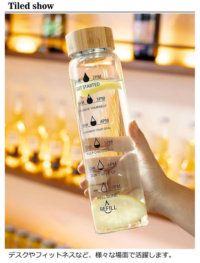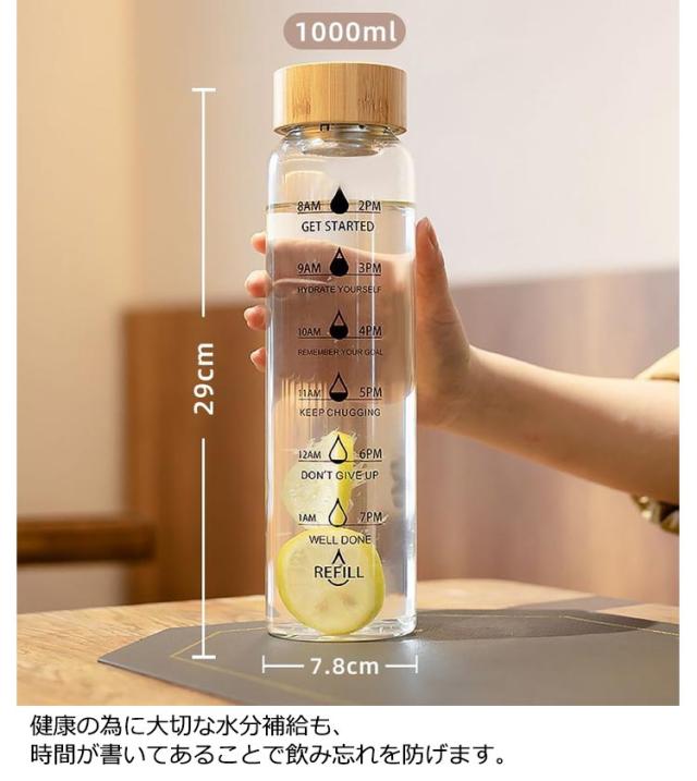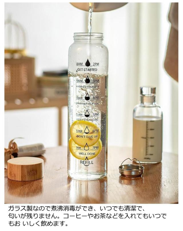 | 目盛りと一緒に「時間」が書かれている便利なウォーターボトルです。 デスクやフィットネスなど、様々な場面で活躍します。 健康の為に大切な水分補給も、時間が書いてあることで飲み忘れを防げます。 ガラス製なので煮沸消毒ができ、いつでも清潔で、匂いが残りません。コーヒーやお茶などを入れてもいつでもお いしく飲めます。 丸みがあり、なめらかな飲み口は飲み物を心地よく飲めるのが特徴です。 ボトルカバー付き。 | |