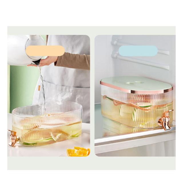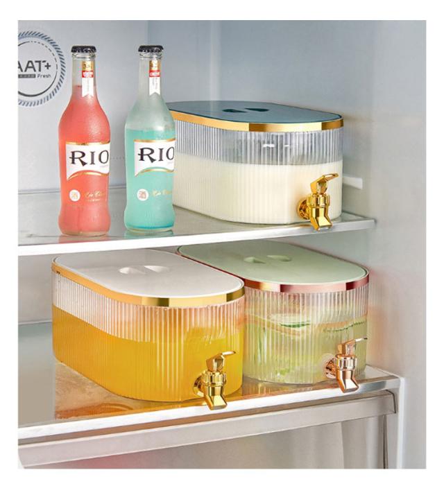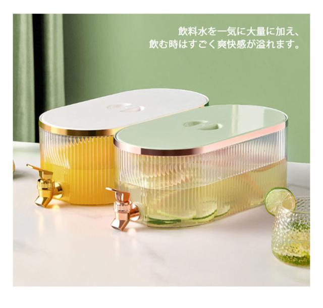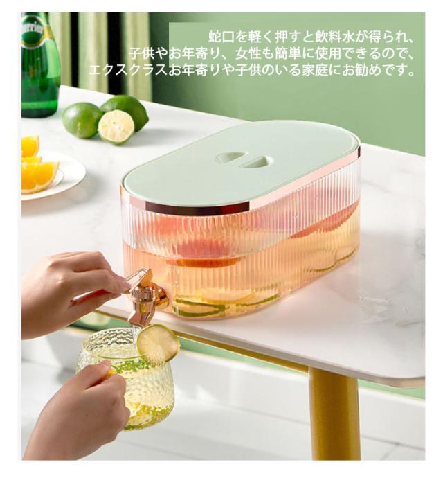 | 蛇口があるので、ビールやジュースなどの飲料水を注いで、そして冷蔵庫に入れたら、夏の日はいつも冷たい飲み物を飲ませます。 蛇口を軽く押すと飲料水が得られ、子供やお年寄り、女性も簡単に使用できるので、エクスクラスお年寄りや子供のいる家庭にお勧めです。 約5.3Lの容量を保持できます。 飲料水を一気に大量に加え、飲む時はすごく爽快感が溢れます。 ジュース、アイスティー、レモネード、ミルク、その他の飲み物を入れることができます。 大きな角氷、フルーツスライスもいれます。 大口径で底まで洗いやすい、いつでも衛生的に飲み物を楽しみます。 | |