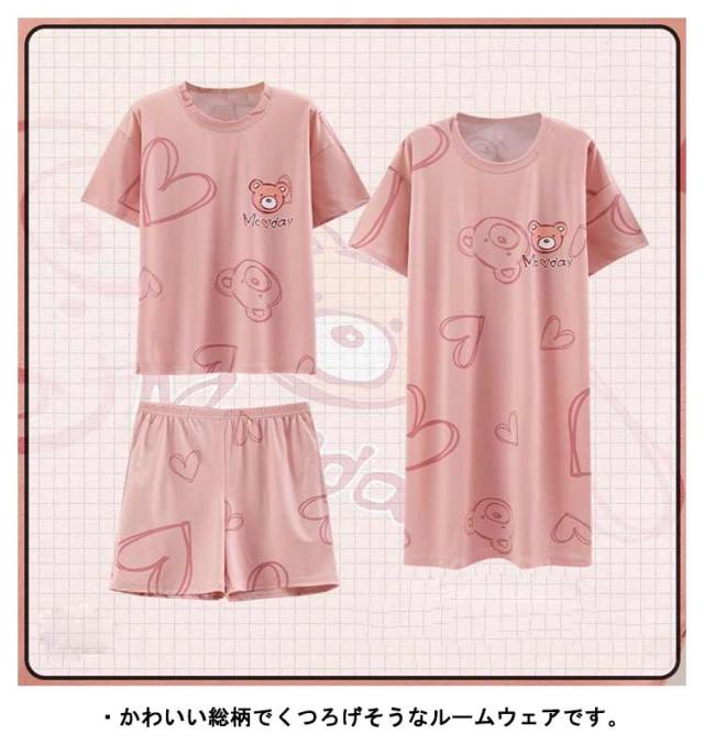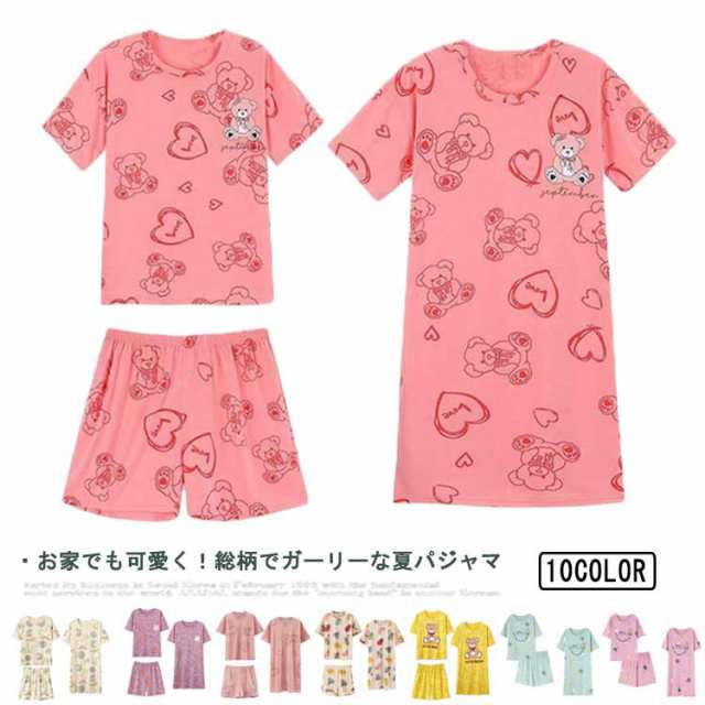 パジャマ 上下セット 3点セット レディース 半袖 Tシャツ ショートパンツ ワンピース 寝巻き ルームウェア 部屋着 ジュニア 女子 英字 アニマル柄 くま ウサギ 総柄 可愛い 夏 全10色
