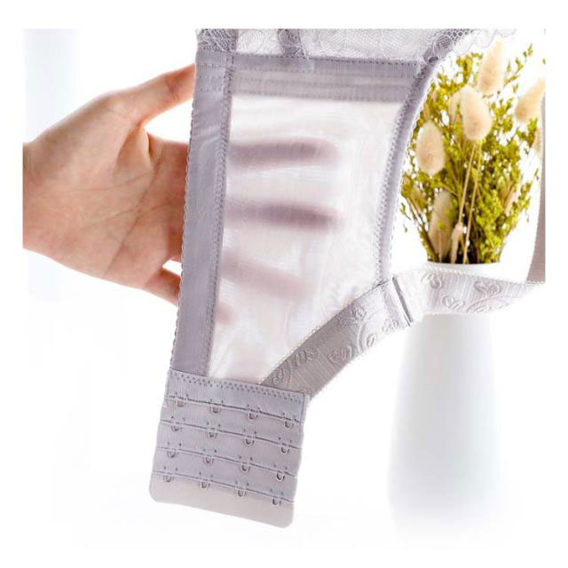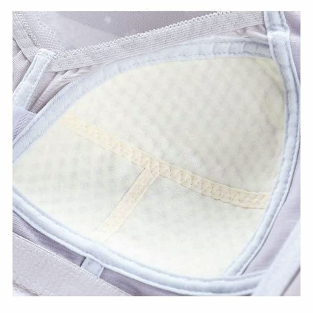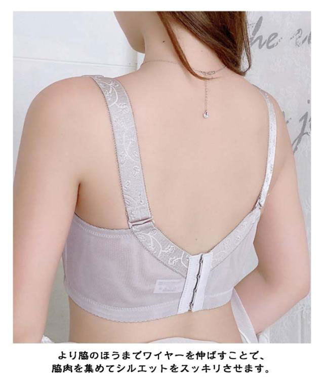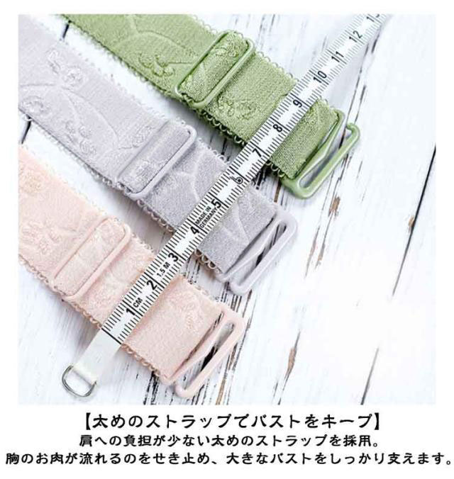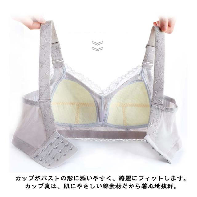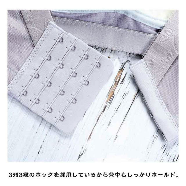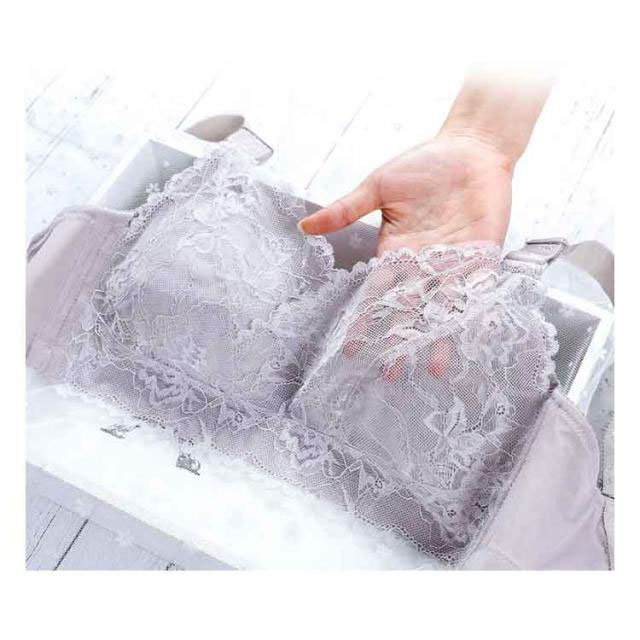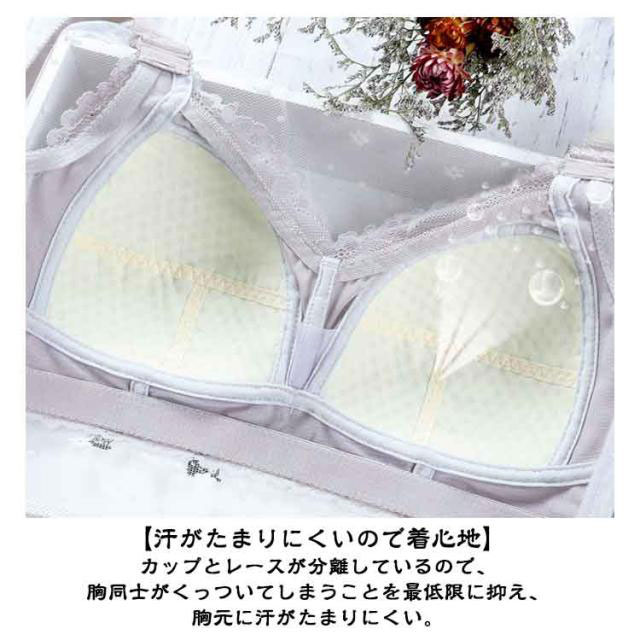 | 【小さく見えるブラ】【薄手・通気】【軽い・柔らか】 【バストの膨らみ、立体感を抑えたカップ】 より胸を小さく見せるようカップの膨らみは極限まで抑えつつ、自然で美しいバストラインを実現。 胸を押し潰すだけじゃない独自設計だから、ストレスフリー。 【伸縮性のあるレースではみ出る胸をしっかりホールド】 フロント上部に伸縮性のあるゴムを入れ、視線が気になる谷間部分も高級感のあるラッセルストレッチレースでしっかりガード。 さらに小胸に見えるよう設計しました。バスト全体をレースで覆っているので苦しくなりません。 【脇高設計!流れるお肉をしっかりキャッチ】 脇高設計でお肉が脇に流れるのを防ぎ、気になるはみ肉の凸凹もスッキリ綺麗に。 より脇のほうまでワイヤーを伸ばすことで、脇肉を集めてシルエットをスッキリさせます。 【太めのストラップでバストをキープ】 肩への負担が少ない太めのストラップを採用。胸のお肉が流れるのをせき止め、大きなバストをしっかり支えます。3列3段のホックを採用しているから背中もしっかりホールド。 【汗がたまりにくいので着心地】 カップとレースが分離しているので、胸同士がくっついてしまうことを最低限に抑え、胸元に汗がたまりにくい。 カップがバストの形に添いやすく、綺麗にフィットします。カップ裏は、肌にやさしい綿素材だから着心地抜群。 | |