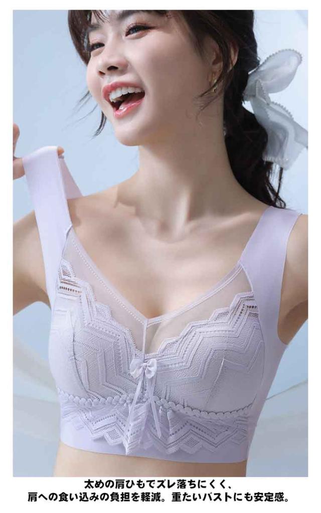 | 【L-5XL】【5color】【胸を小さく見せる】 大きな胸を小さく見せてくれるブラジャー。 脇高仕様で押さえたバストが流れないようにカバー。 太めの肩ひもでズレ落ちにくく、肩への食い込みの負担を軽減。重たいバストにも安定感。 フロントのレースは見えてもかわいく、伸縮性のある素材で、しめつけすぎないフィット感。 胸元に谷間ガード用のメッシュ付き、ノンワイヤーで胸をしっかりホールド美バストに。 U字型のバックストラップが背中のぜい肉をキャッチし綺麗な後ろ姿を演出。 すっきり洋服を着こなしたい方はもちろん、着物や浴衣等の和装にもおすすめ。 | |