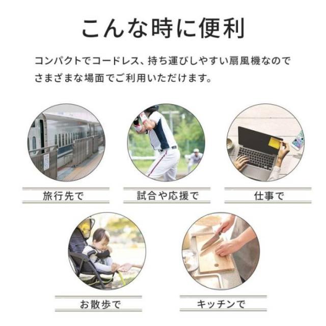 ・コンパクトでコードレス、持ち運びしやすい扇風機なのでさまざまな場面でご利用いただけます。