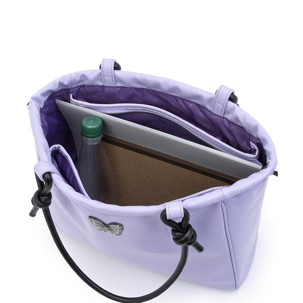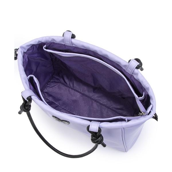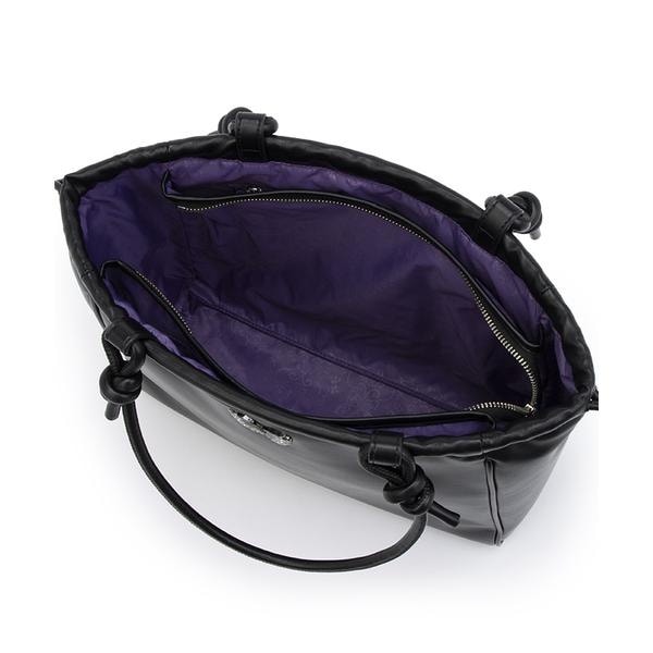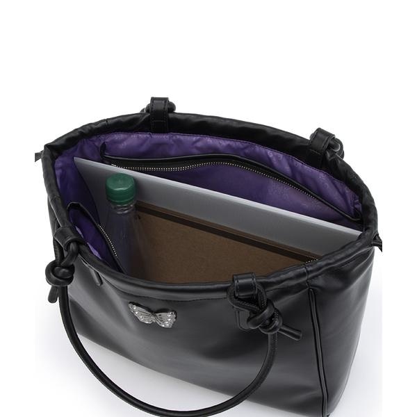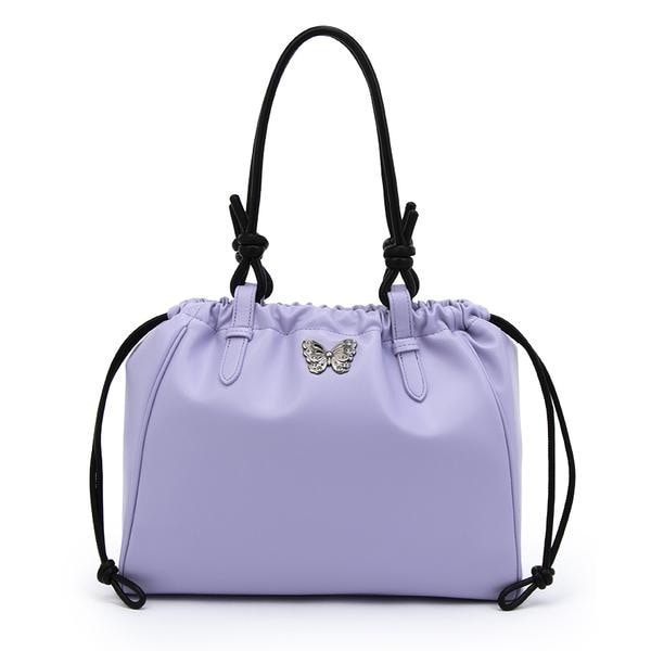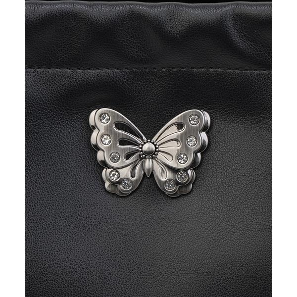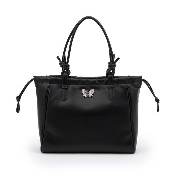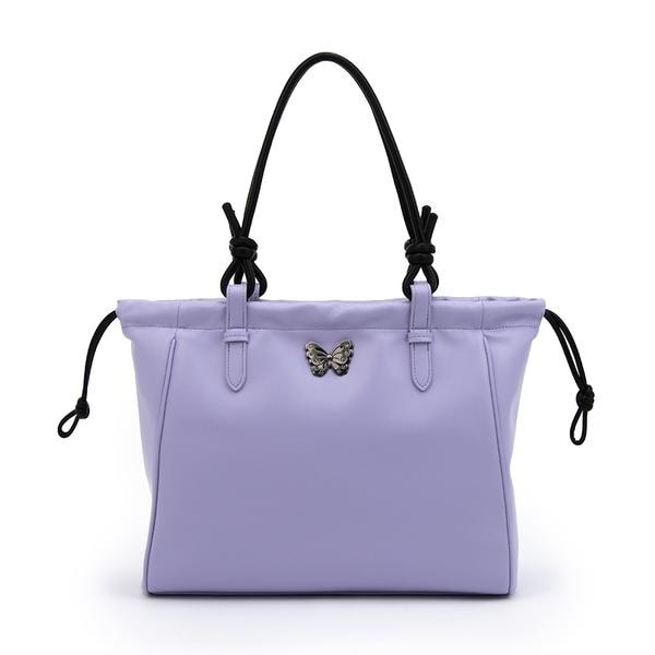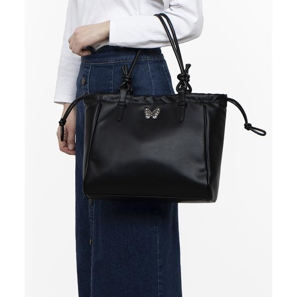 メタルバタフライが目を引く「エイミー」シリーズ。バタフライはブランドの特徴的なモチーフでありながら、ここ数年Y2Kファッションの中でも再注目されている人気モチーフ。バッグ本体の素材には、肌触りが良く、非常に軽量な合皮を使用。どのカラーも付属を黒にすることで、どんなコーディネートやシーンにも合わせやすいデザインに仕上げました。トートバッグは、口元の紐をきゅっと絞ることで、ころんとした可愛らしいシルエットになるのもポイントです。【製品寸法】F : 縦:28, 横:33−39, マチ:8, 持ち手:50【素材】合成皮革【メーカーサイズ寸法(実寸)】F : 幅:33−39cm, 底マチ:8cm, 持ち手高さ:50cm