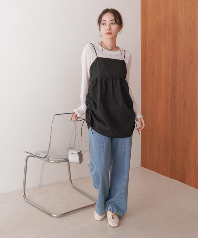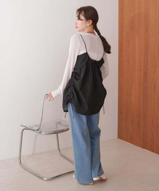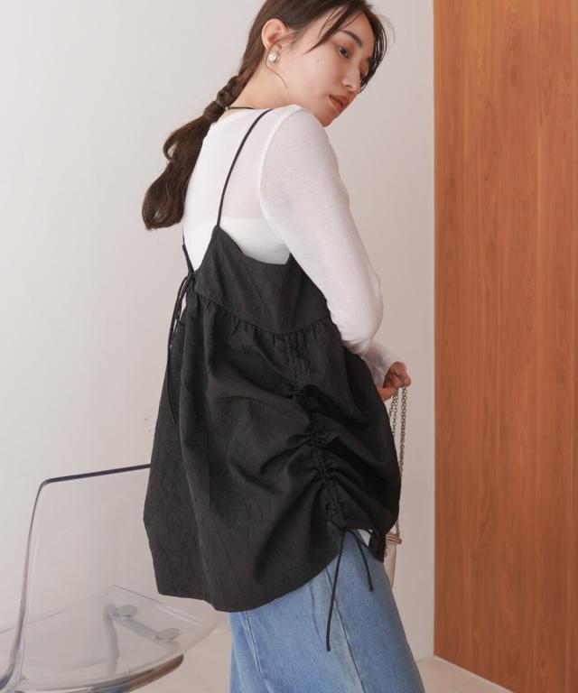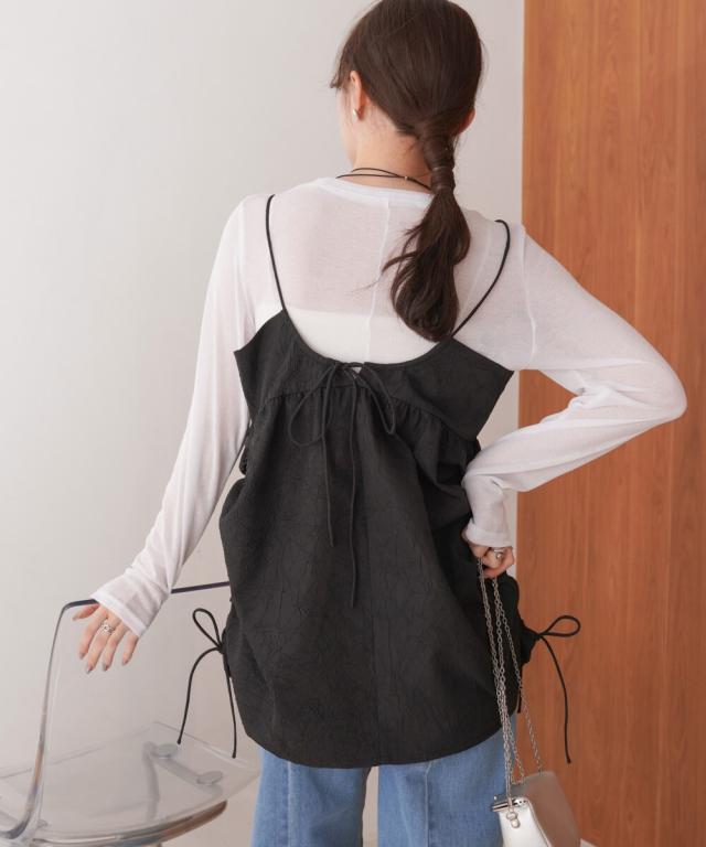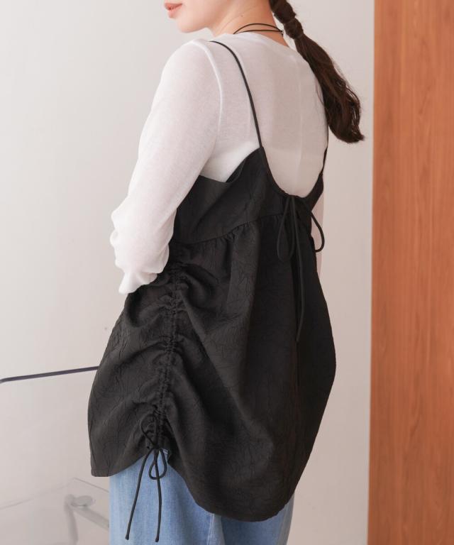 程よい光沢・ハリ感のあるドレープがレイヤードコーデをクラシック×モードにするトレンドのキャミビスチェの登場です。いつものスタイリングやワントーンコーデにオンするだけで、一気にこなれた印象になります。高級感のある上品な2色展開でその日の気分やコーデに合わせたシルエットにシフトできるサイドリボンも嬉しいポイント◎