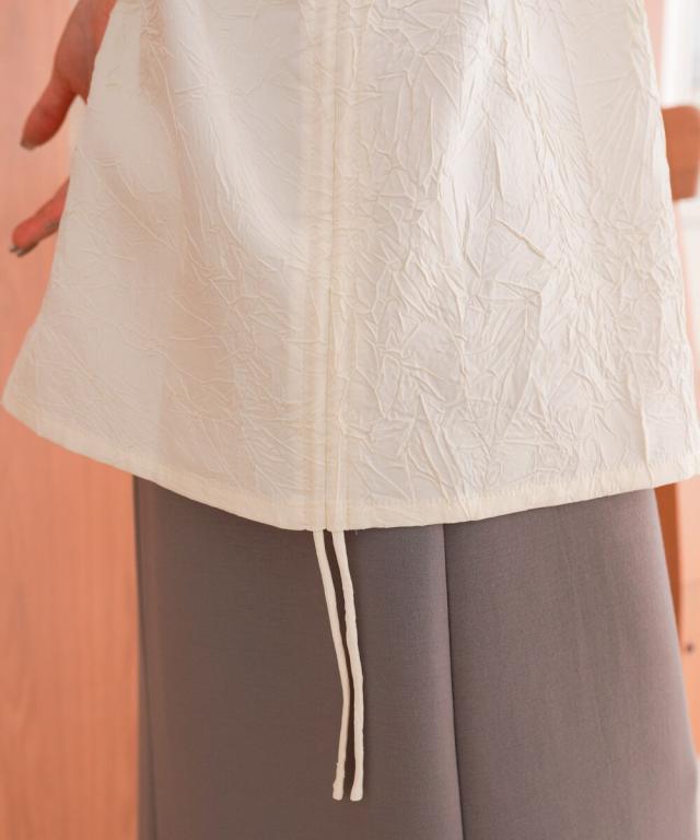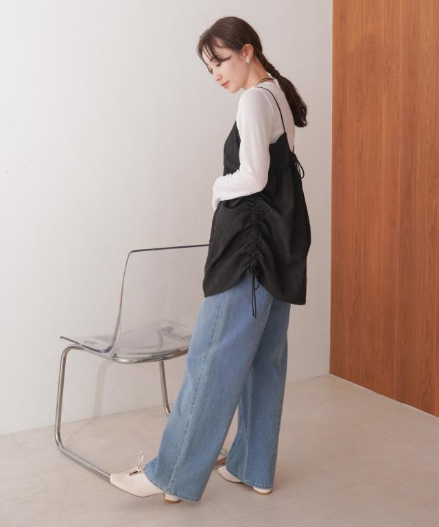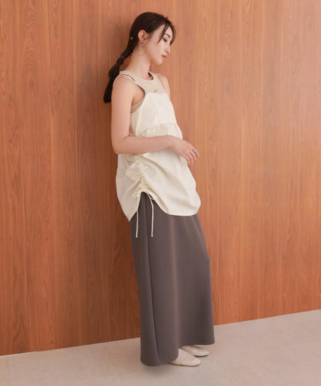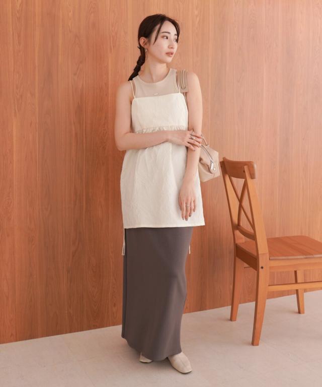 サイドのリボンを解いてAラインにもシフトできるので、気になる腰回りもカバーしてくれます。シアー感のあるトップスやタンクトップにレイヤードした大人ヘルシーコーデもニュアンス感があり素敵です。コーディネートによって幅広く着回しのできるアイテム。
