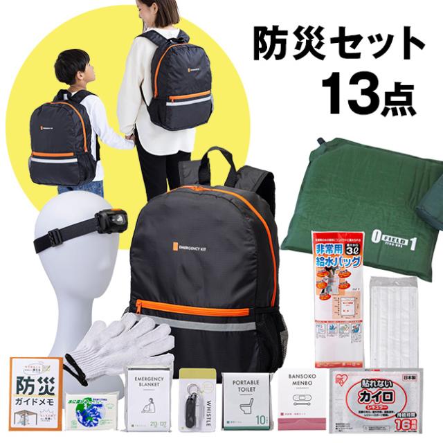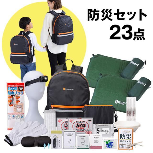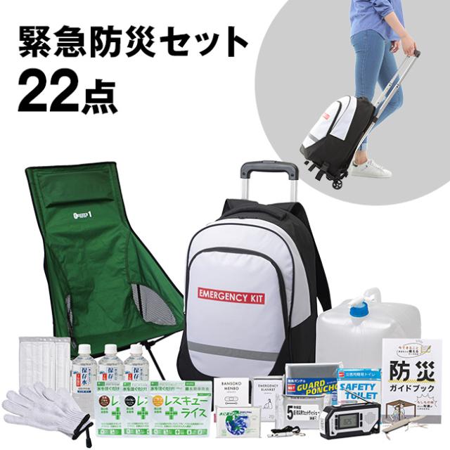 【セット内容】[1]キャリー付防災リュック(耐荷重20kg・容量22L)×1 [2]レスキューライス 五目ごはん×1 [3]レスキューライス ドライカレー×1 [4]レスキューライス ピラフ×1 [5]アルカリ保存水(500ml)×3 [6]八徳ナイフ×1 [7]ウォータータンク(10L)×1 [8]マルチレスキューライト2×1 [9]ガードポンチョ×1 [10]携帯トイレ(5回分)×1 [11]絆創膏×2枚・綿棒×10本 [12]使い捨てマスク×2 [13]ウェットティッシュ(20枚)×1 [14]水に流せるポケットティッシュ×1 [15]非常用呼子笛×1 [16]静音アルミブランケット×1 [17]防災ガイドブック×1 [18]軍手×1 [19]リラックスチェア×1