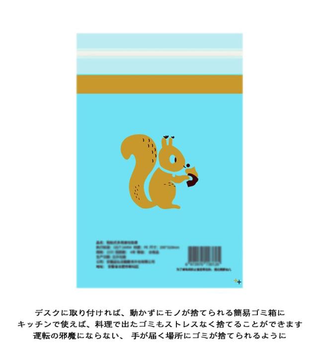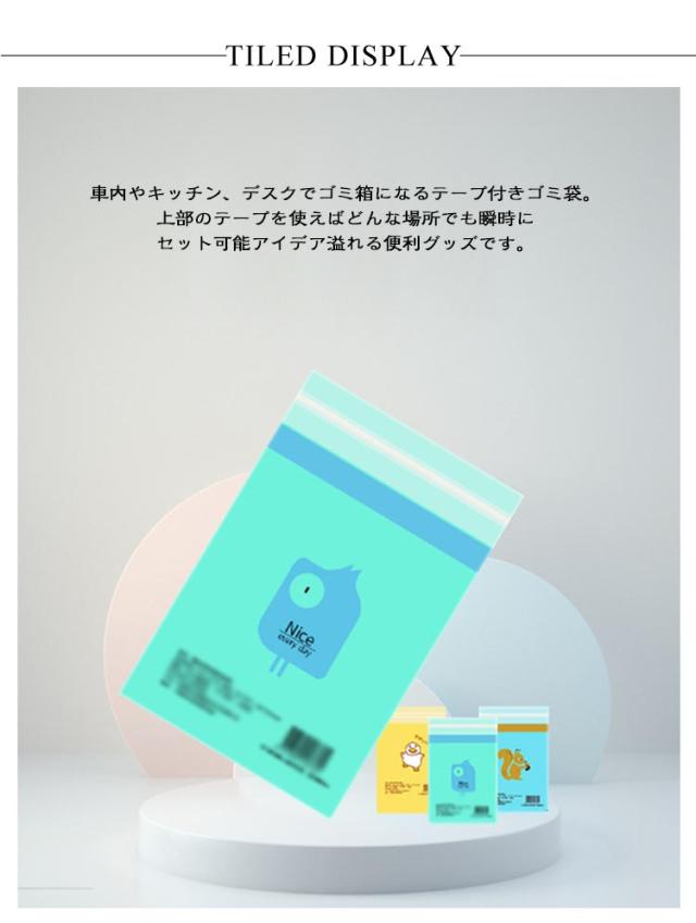 | テープで取り付けて閉じるキャラクターゴミ袋 21*31cm 【45枚セット】 3色 車内やキッチン、デスクでゴミ箱になるテープ付きゴミ袋。 上部のテープを使えばどんな場所でも瞬時にセット可能アイデア溢れる便利グッズです。 車内やアウトドアだけでなく、デスクやキッチンにセットすればゴミ箱の場所をとらずに省スペースで使用可能になります。 使ったあとはテープで簡単に密閉できるので、片付けも楽ちんで便利なゴミ袋です。 付属のテープで「付ける」「密閉する」 ゴミ袋のセットから、捨てるまでが簡単に! 1.テープを剥がして 2.ピタッと貼り付け 3.ゴミが溜まったら 4.袋を折ってテープで密閉! デスクに取り付ければ、動かずにモノが捨てられる簡易ゴミ箱に キッチンで使えば、料理で出たゴミもストレスなく捨てることができます 運転の邪魔にならない、 手が届く場所にゴミが捨てられるように マチなしが便利! 膨らまないので、わずかな 「スペースにも設置が可能です 思わず手を伸ばしたくなるデザイン 座席に取り付ければ、子供も捨てやすい後部座席専用のゴミ箱に 完全防水だから、汁物も安心して捨てることができます ゴミが溜まっても綺麗な見た目 半透明で中が見えにくいゴミ袋です | |