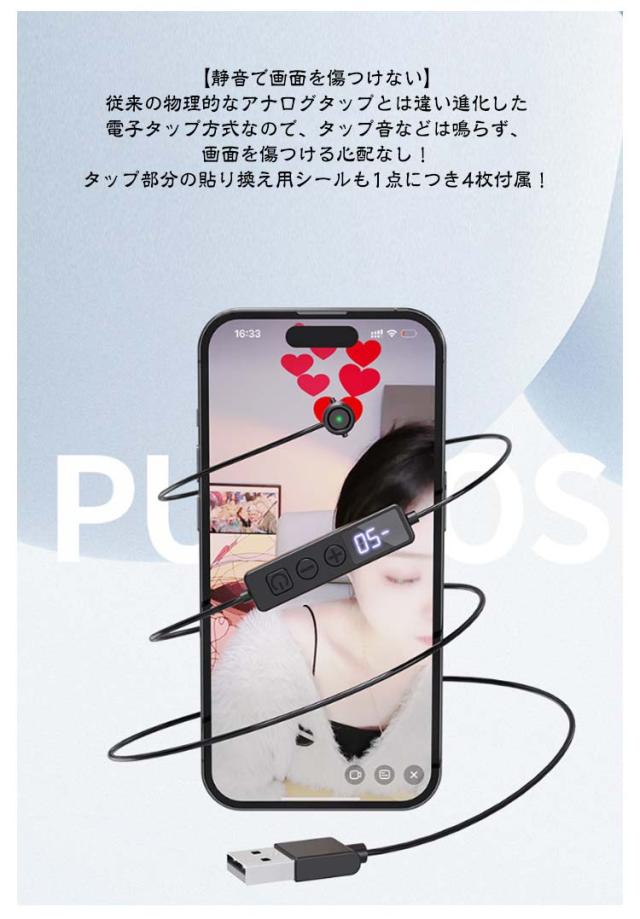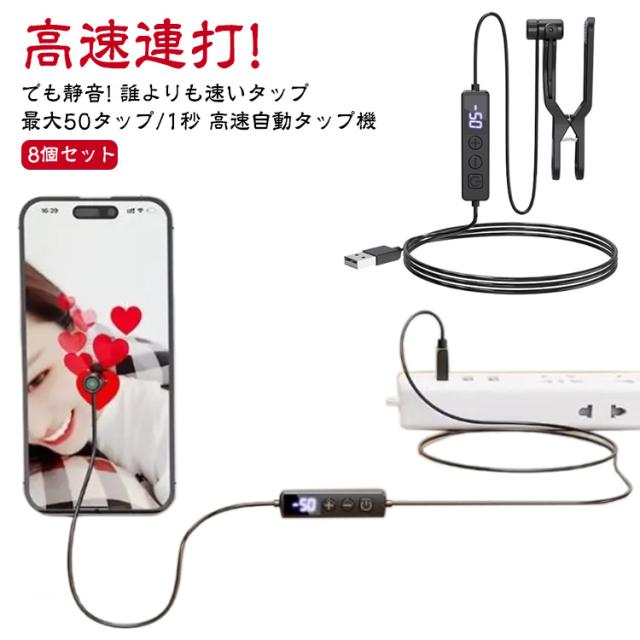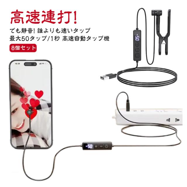 | 高速連打! でも静音! 誰よりも速いタップ 最大50タップ/1秒 高速自動タップ機 【8個セット】 ●スマホの画面を高速自動タップ!● スマホゲームやライブ配信などのいいねを連打する際に大活躍! 【多段階速度調節】 −50〜99まで、117段階で速度調整が可能! 最高速度:1秒間に最大50タップ 最低速度:99秒間に1タップ (最高速度はスマホケースの厚みや、つけ方によって若干誤差があります) 【静音で画面を傷つけない】 従来の物理的なアナログタップとは違い進化した電子タップ方式なので、タップ音などは鳴らず、画面を傷つける心配なし! タップ部分の貼り換え用シールも1点につき4枚付属! 【USB給電式】 約90cmの十分な長さのあるUSBコード! 電源タップやパソコンなどの電子機器に接続してご使用ください。 ※充電式ではないのでコード未接続の状態では使用できません。 【便利なクリップ式】 スマホに挟んで固定できる便利なクリップ式! 狙った場所に挟んだまま固定できるので、スイッチをONにして放置してもOK! ※高速で長時間使用したままにすると、機械が熱を持ち破損する可能性がございますのでお気を付けください。 | |