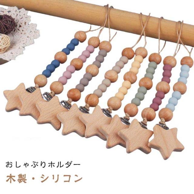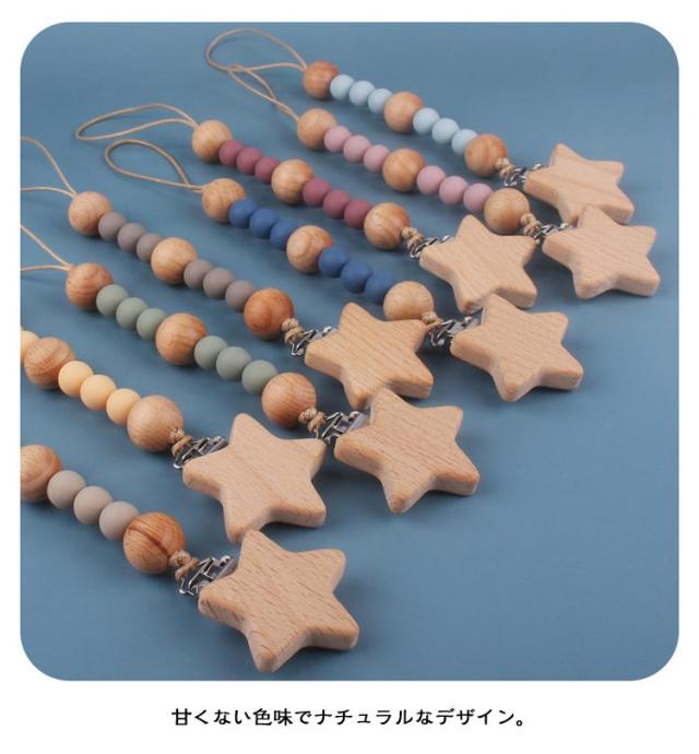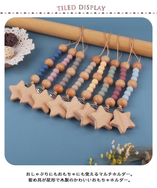 | 【おしゃぶりホルダー】【木製・シリコン】 おしゃぶりにもおもちゃにも使えるマルチホルダー。 留め具が星形で木製のかわいいおもちゃホルダー。 甘くない色味でナチュラルなデザイン。 子どもの服やベビーカーに付けて、おもちゃやおしゃぶりがなくならないように固定するストラップです。 シリコンBPAフリー・フタル酸エステル等の環境ホルモンを含まない 木製パーツは全て無塗装・無着色の天然木製です。 | |