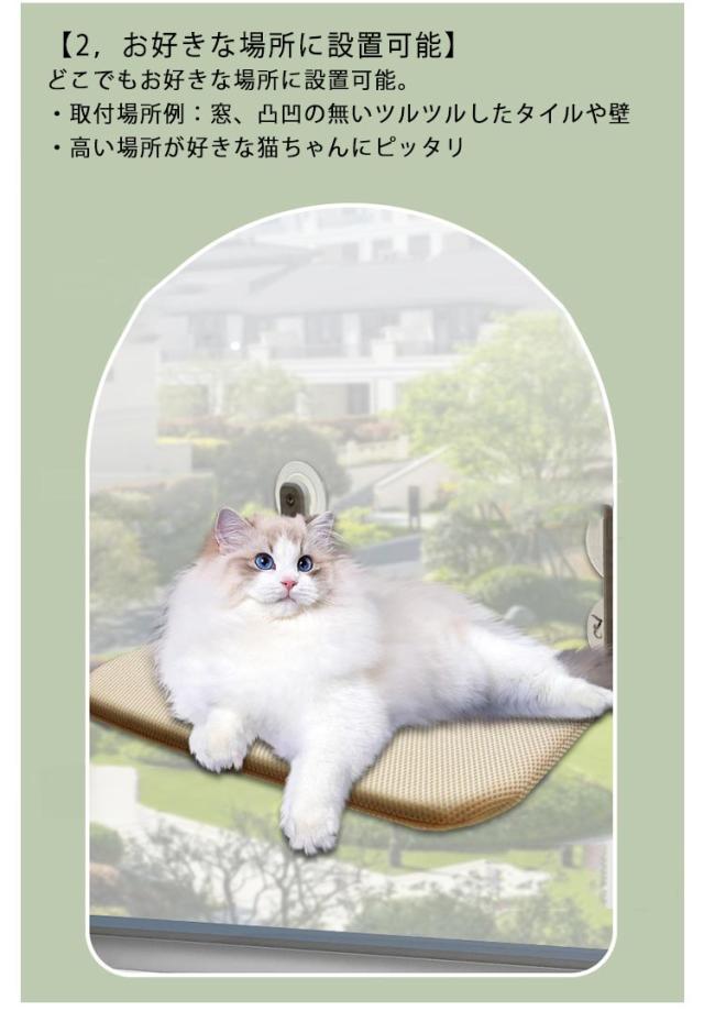 | 【1、外を眺められる】 窓に設置できるから、大好きなお外をいつでも眺められる。 複数個を取り付ければ、キャットステップとしても大活躍 多頭飼いのご家庭にもおすすめです 【2,お好きな場所に設置可能】 どこでもお好きな場所に設置可能。 ・取付場所例:窓、凸凹の無いツルツルしたタイルや壁 ・高い場所が好きな猫ちゃんにピッタリ 【3,安定感が抜群】 強力な吸盤で、ピタッと固定。 グラつかず、安定感が抜群です 耐荷重:(約)15kg 【4,簡単取り付け】 誰でも簡単に取り付けが可能、吸盤をくっつけるだけ 難しい作業は、必要ありません 【5,折り畳みが可能】 使わない時は、折り畳んで収納が可能。 カーテンの邪魔をしないので、とっても便利 カバーは取り外してお洗濯ができるから、ずっと衛生的に使えます。 (※洗濯機でお洗濯をする場合は、洗濯ネットに入れてのご使用をおすすめいたします。) | |
