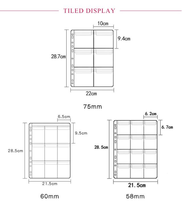 | サイズについての説明 | 【58mm】ポケット直径58mm、一枚リフィル12個ポケット。総6枚リフィル 【60mm】ポケット直径60mm、一枚リフィル9個ポケット。総6枚リフィル 【75mm】ポケット直径75mm、一枚リフィル6個ポケット。総6枚リフィル |