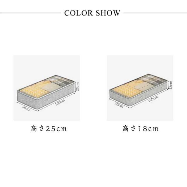 | スペースを有効活用・ベッド下収納ケース。 ベッド下のスペース、クローゼットの空きスペース、押入れの隙間などにピッタリな収納ケース。 セーター45枚以上やダウンコート25枚以上、布団など収納できます。 毛布、布団、枕、靴、おもちゃなど幅広くご使用できます。理想的なベッド下収納ケースです。 通気性の良い不織布で、オフシーズンの衣類や布団などを湿気やホコリから守り大切に保管できます。 取っ手(引き手)がついているので、ベッド下や押入れからの出し入れもラクラク。 透明窓からケースを開けずに中身が見えるので、収納物を探す手間が省けて効率的。 | |