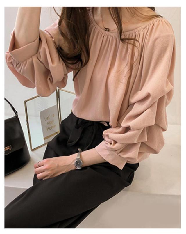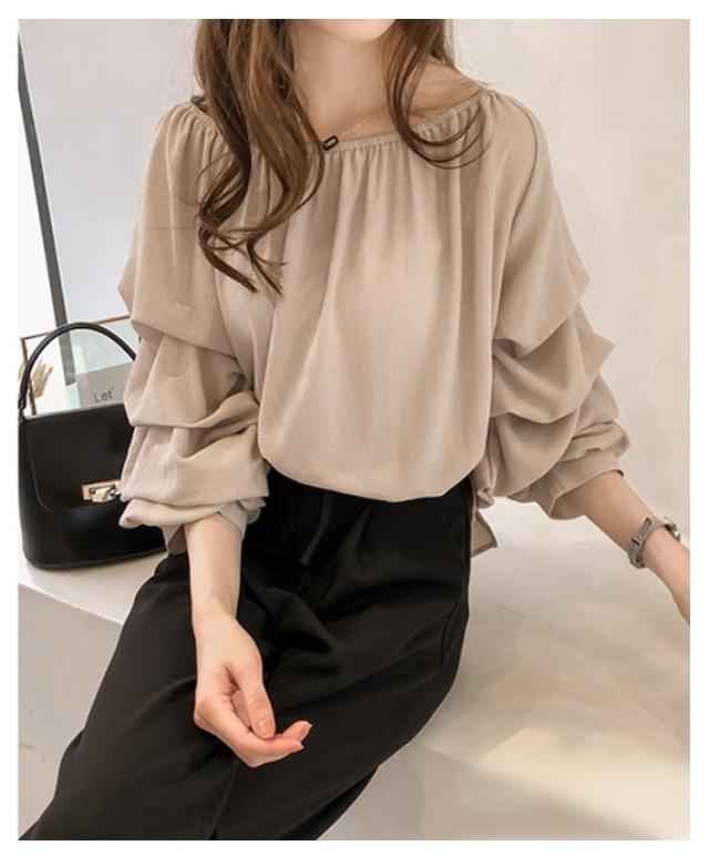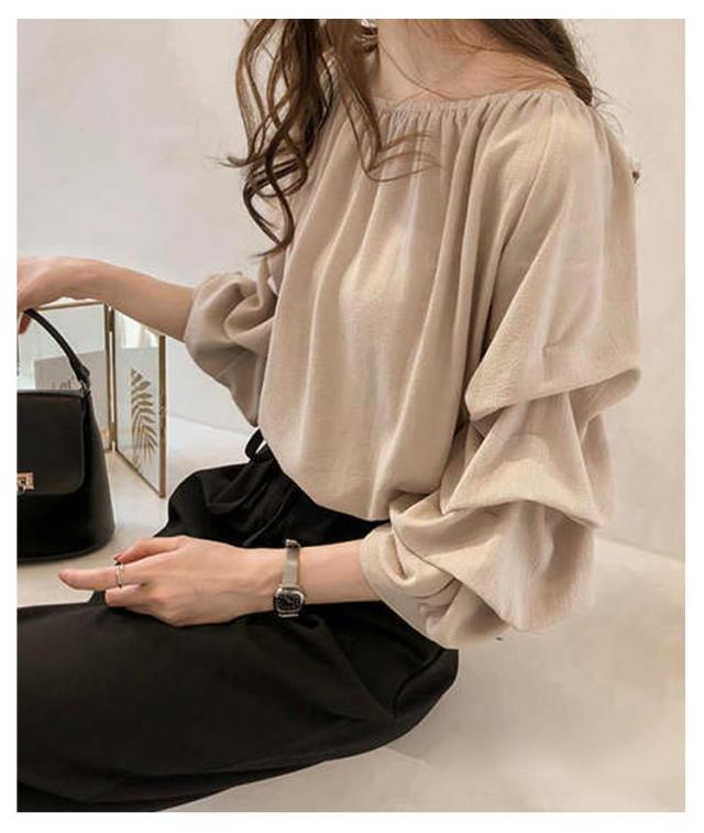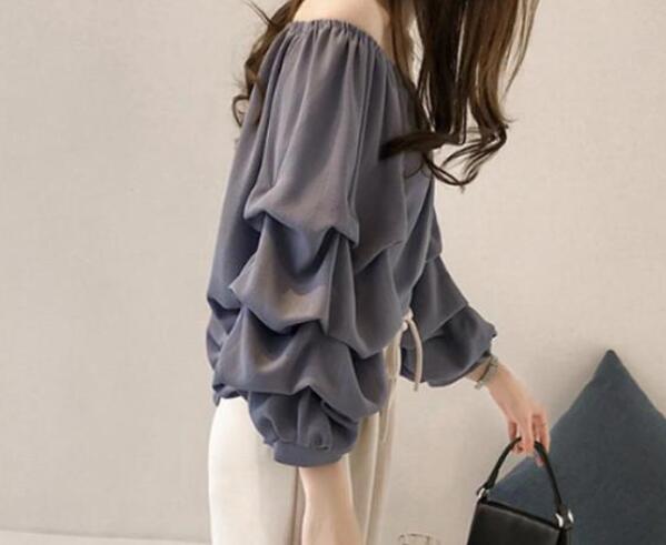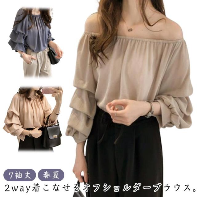 セクシー オフショルダー ボリューム袖 パフ袖 7袖丈 ブラウス スリーブ クルーネック 2way シャツ タック シフォンシャツ 肩見せ 春夏 バルーンスリーブ ブラウス オフショルブラウス シワになりにくい