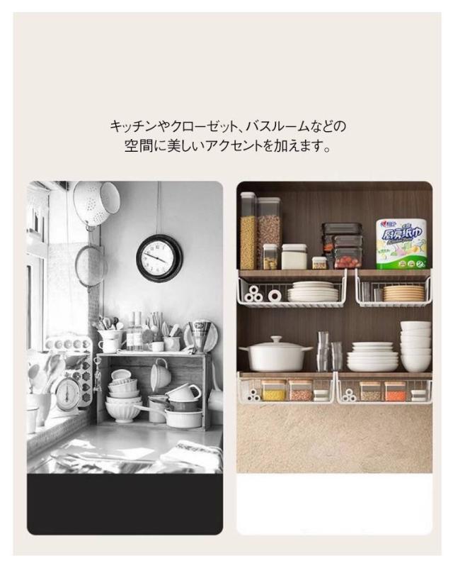 | 吊り下げ戸棚下収納ラック 2点セット。 見た目、機能性だけでなく、材質に鉄を使用し、しっかりとした作りも魅力的です。 吊り下げ戸棚の棚板に差し込むだけで簡単に取り付けられます。 吊り戸棚に引っかけるだけ、工具等は一切不要で簡単設置です。 厚み3.5cm以下の棚に適用します。 シンプルデザインでどんなインテリアにもマッチします。 キッチンやクローゼット、バスルームなどの空間に美しいアクセントを加えます。 | |