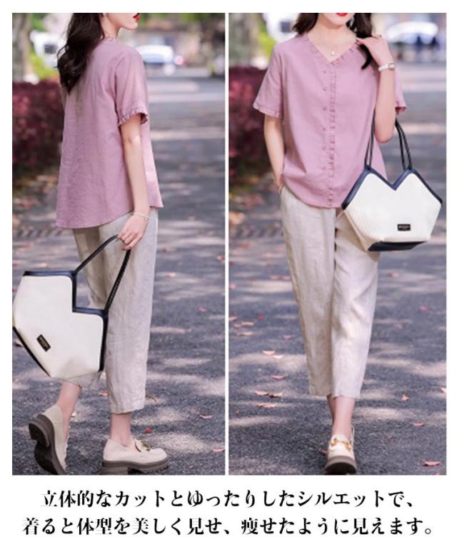 リネン ワイドパンツ ブラウス パンツセットアップ 7分丈 半袖 体型カバー ナチュラル 綿麻 レディース 上下セット おしゃれ カジュアル 夏 きれいめ 着痩せ 無地 薄手 春夏 涼しい 綿麻風 着回し パンツセットアップ 女性 ウエストゴム 部屋着 リラックス