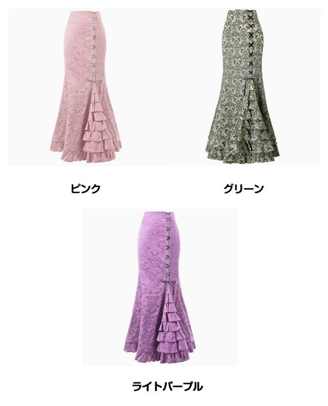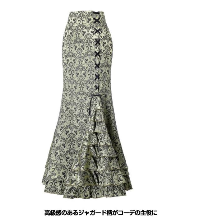 | マーメイドシルエットとレースアップデザインが女性らしいロングスカート。 裾のティアードが動くたびに上品に揺れ動く綺麗めシルエットのスカート。 程よい広がりのマーメイドスカートでスタイルアップ効果も叶います! 高級感のあるジャガード柄がコーデの主役に シンプルなトップスと合わせるだけでスタイリングが決まります。 | |