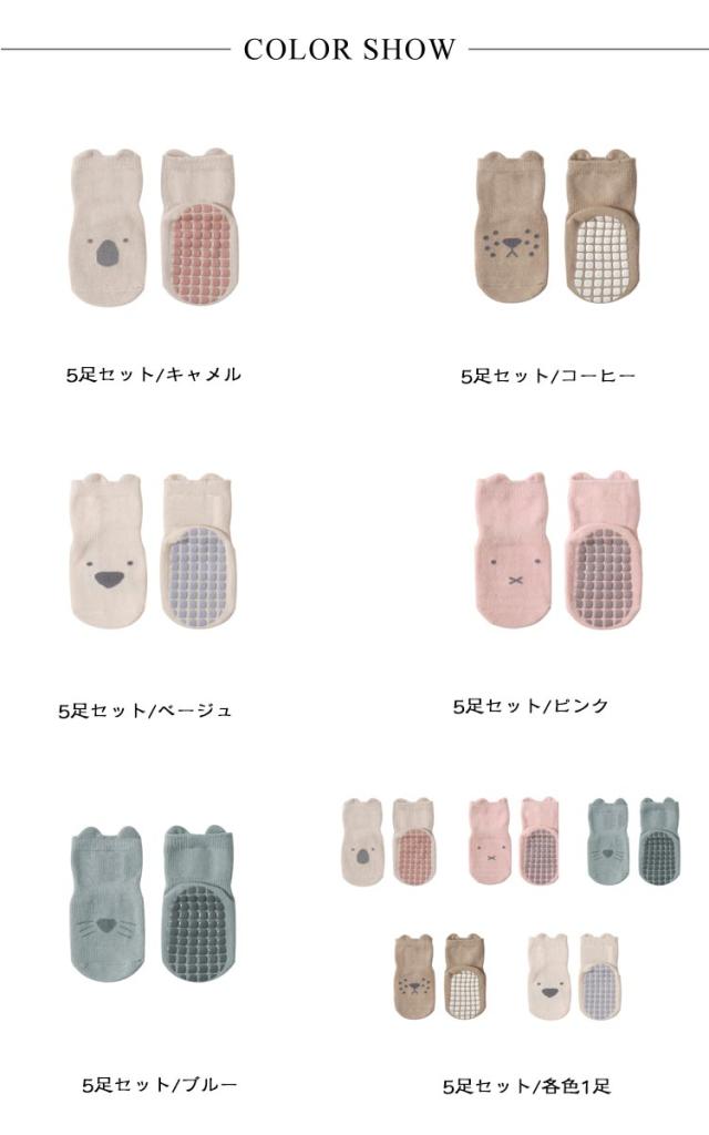 | 色 | 5足セット/キャメル 5足セット/コーヒー 5足セット/ベージュ 5足セット/ピンク 5足セット/ブルー 5足セット/各色1足 |