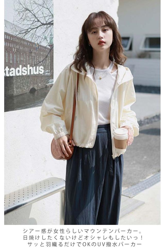 | 手でさらっと羽織れる♪カジュアル過ぎない大人ブルゾン。シアー感が女性らしいマウンテンパーカー。日焼けしたくないけどオシャレもしたいっ!サッと羽織るだけでOKのUV撥水パーカー。 ショート丈とゆったりとしたサイジングが春夏コーデにぴったりな軽やかさを演出。 フード付きだから首元までしっかり紫外線からガード。 さらに長めのお袖で手首もしっかりと覆えます。 なジップデザインとナチュラルなドローコードで、普段使いのしやすいカジュアルな印象に。 両サイドにはポケットもあり、ちょっとしたお出かけにも便利。 着るだけで日焼け対策ができちゃうシンプルなデザインだから、スカートやパンツスタイルにも合わせやすい♪ このUVカットパーカーの魅力は、なんといっても薄手で肌着のようなとろんとした生地感。 暑い時期にもさらりと軽く涼しく着られます。 | |