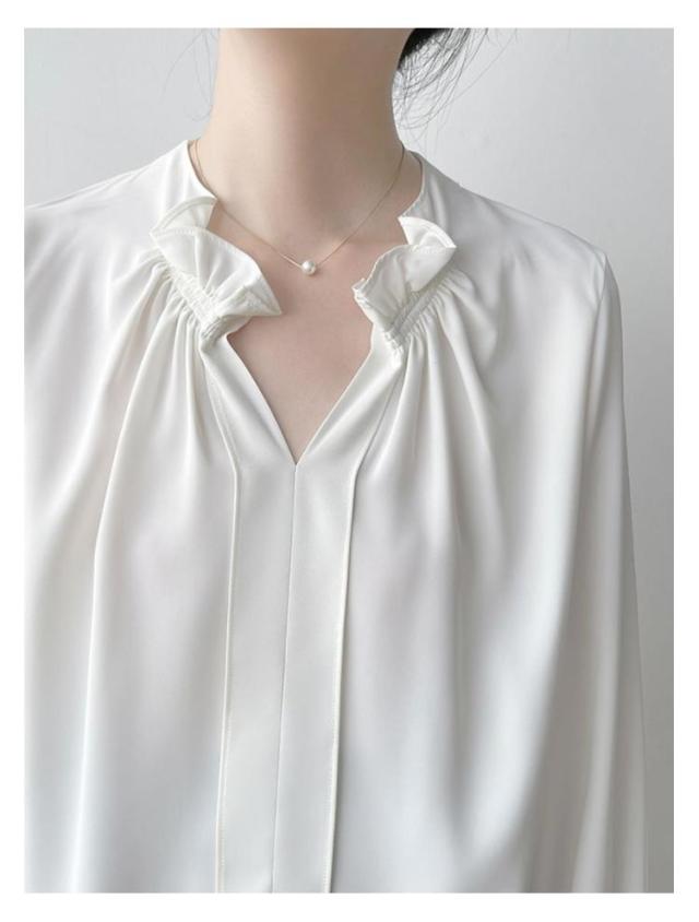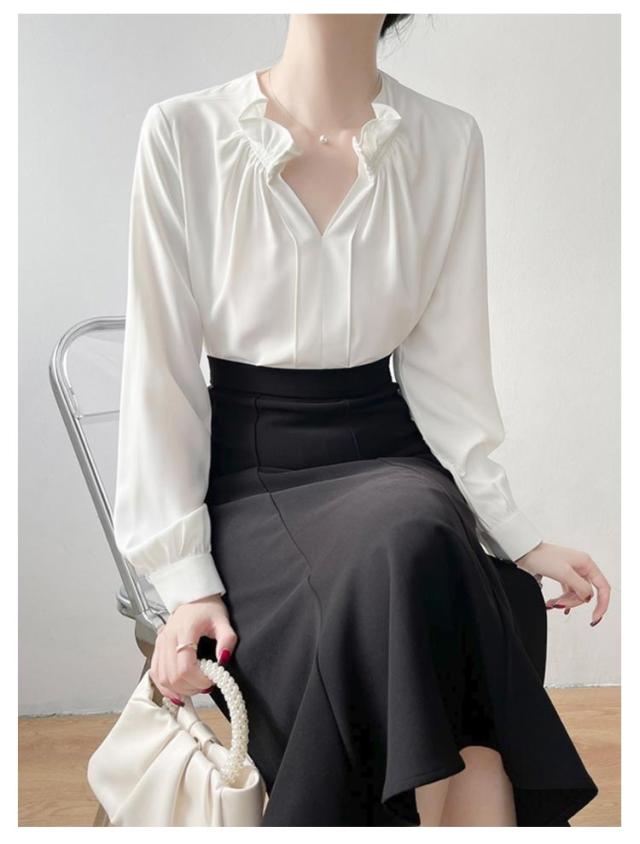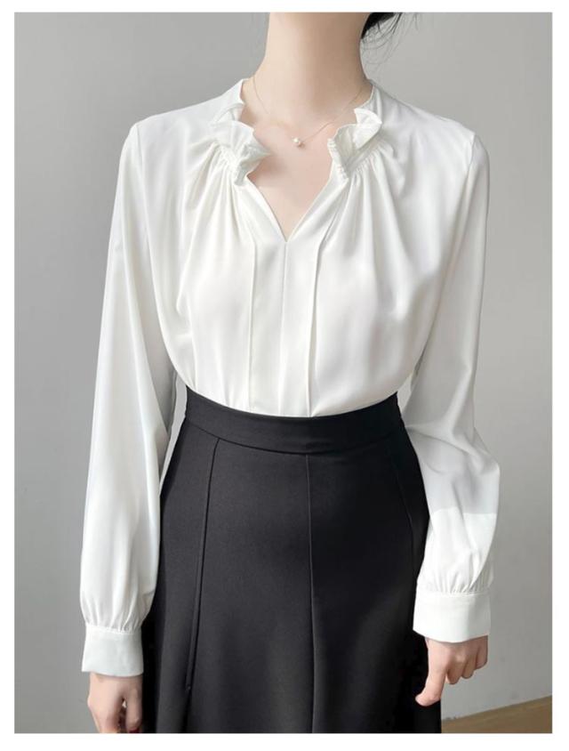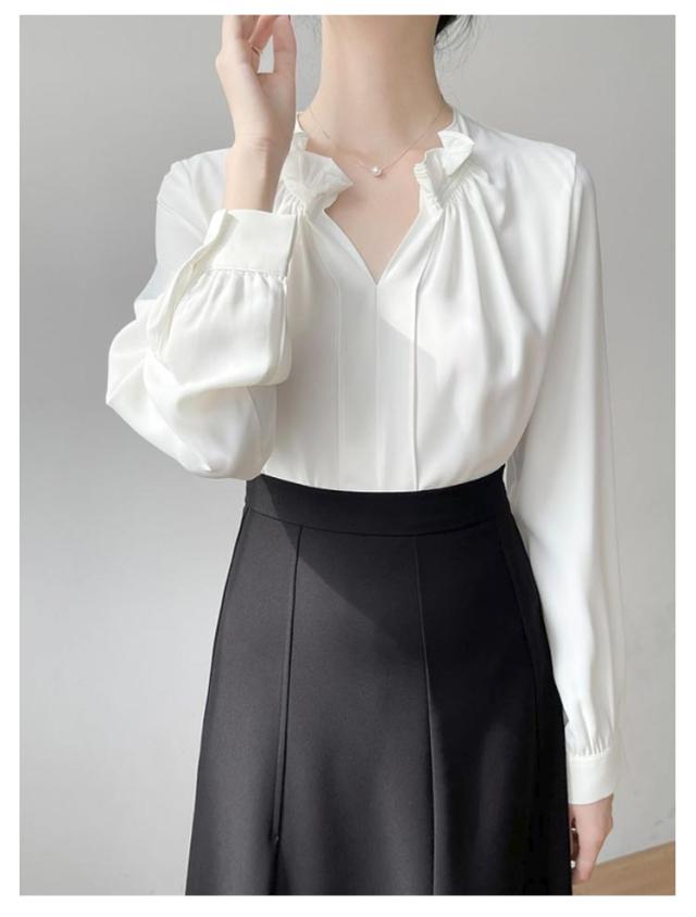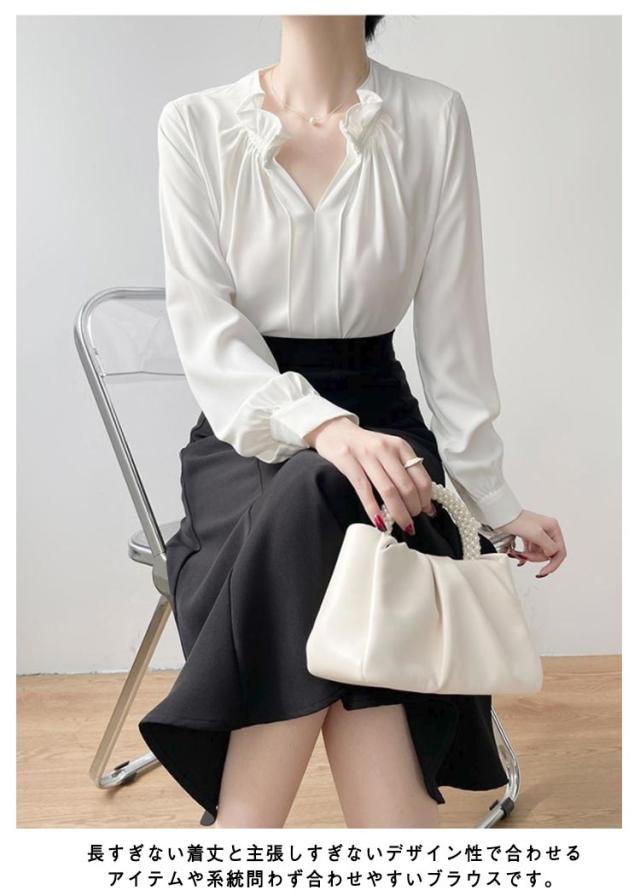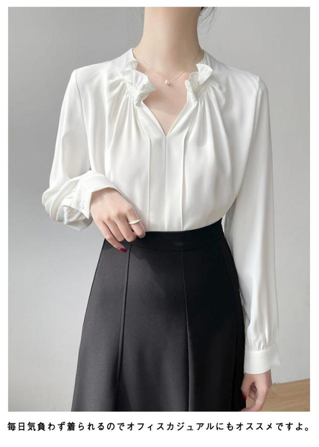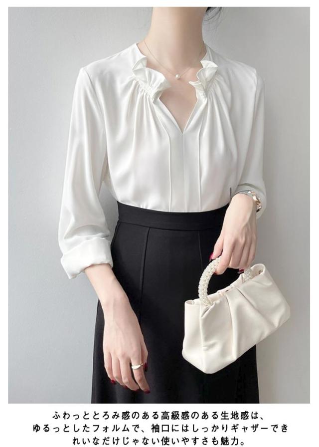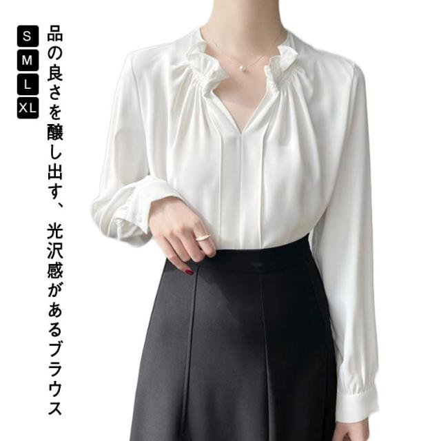 透けない オフィス 華やか フリルネック ブラウス トップス スーツ ブラウス フリル襟 ハイネック レース袖 フォーマル 仕事着 シャツ インナー 光沢感 ギャザー カジュアル シフォン 春夏秋 通勤 仕事 おしゃれ ゆったり 大きいサイズ 20代30代40代50代