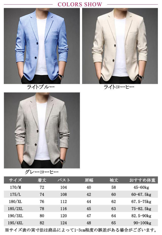 | M-4XL!麻のような爽やかな風合いのテーラードジャケットです。 吸汗性と速乾性に優れたポリエステル生地を使い、機能性にも優れたアウターとなっております。 大人かつ上品な雰囲気を演出。 カジュアルは勿論、ドレッシーでパーティーのジャケットコーデやゴルフの行き来にもお勧め。 シンプルなデザインなので、合わせるアイテムを選ばず万能に活躍します。 | |