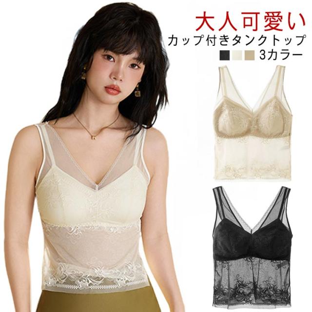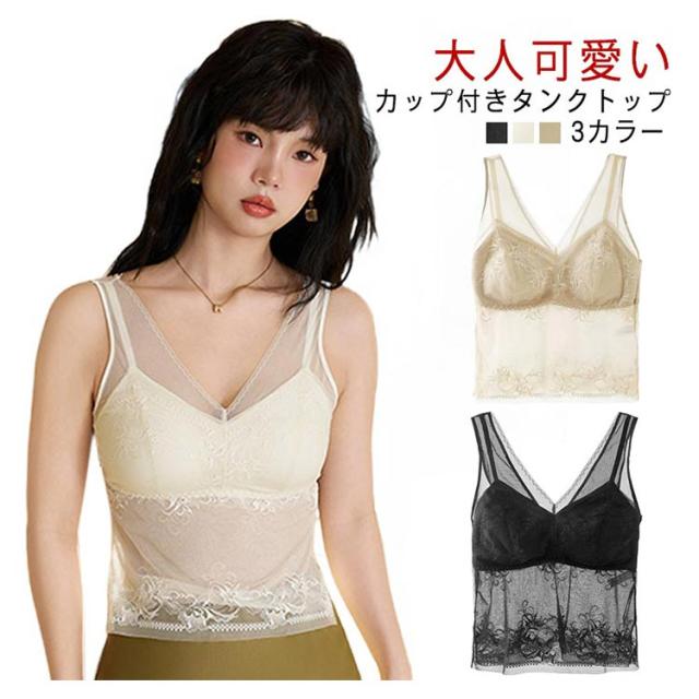 トップス 送料無料 ノースリーブ レディース ノンワイヤー タンクトップ Vネック ブラトップ 送料無料 総レース シースルー ブラ紐隠し 肌見せ カップ付きインナー 女性肌着 見せるインナー セクシー 透け感 花柄 おしゃれ 可愛い