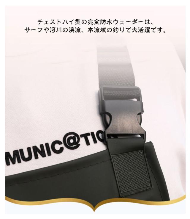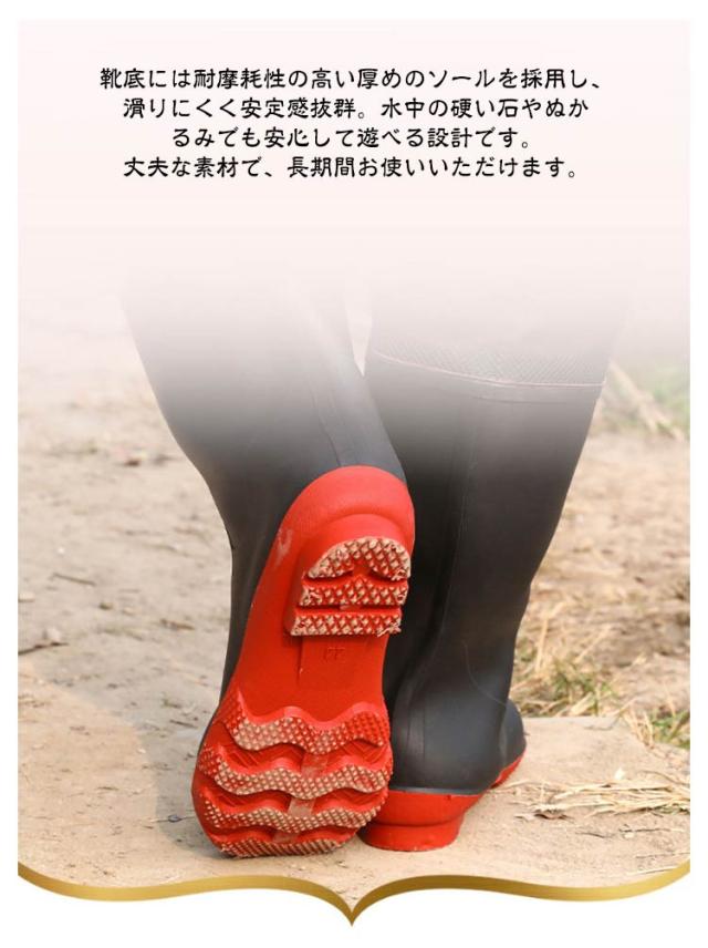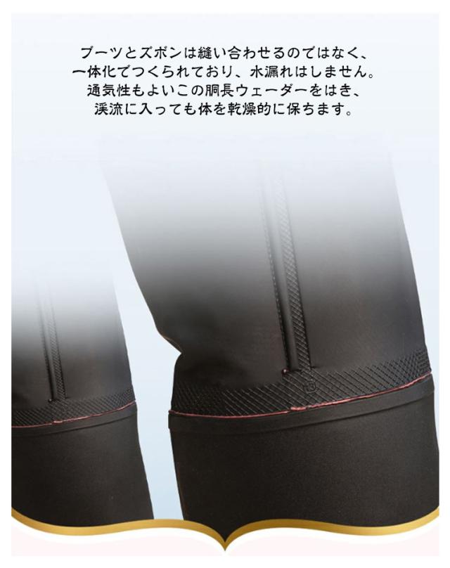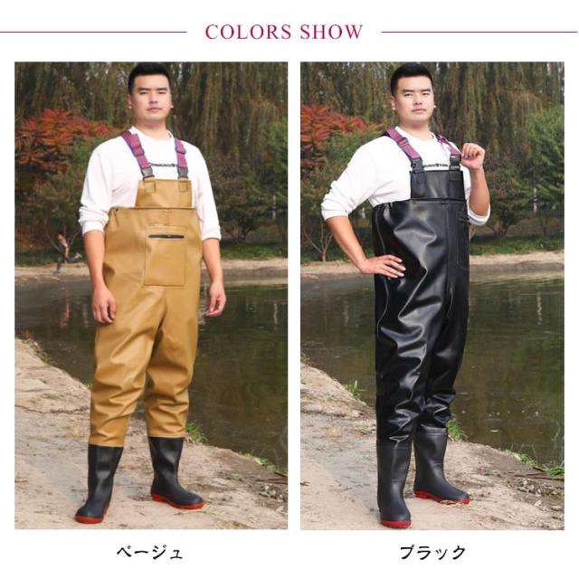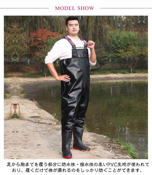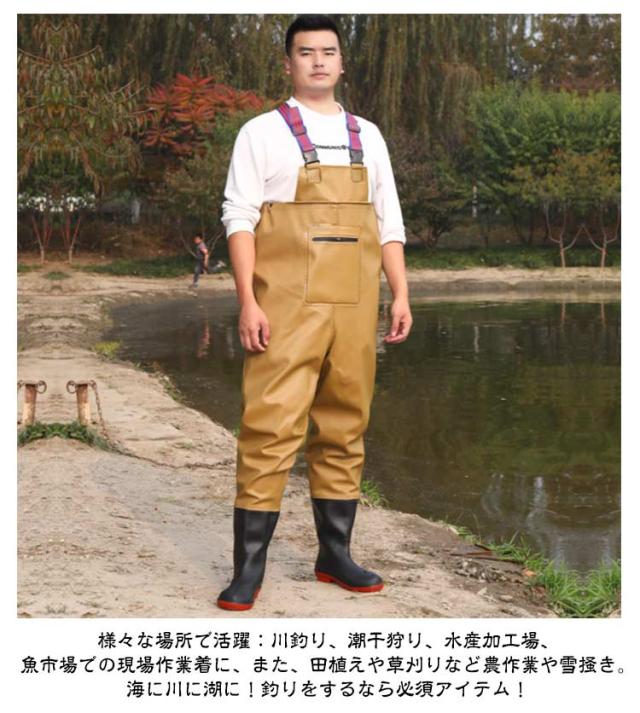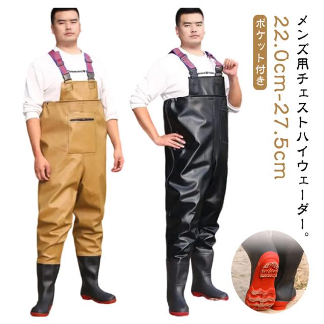 | メンズ用チェストハイウェーダー。【22.0cm−27.5cm】【ポケット付き】 足から胸までを覆う部分に防水性・撥水性の高いPVC生地が使われており、履くだけで体が濡れるのをしっかり防ぐことができます。 チェストハイ型の完全防水ウェーダーは、サーフや河川の渓流、本流域の釣りで大活躍です。 PVC加工で防水性・撥水性の高い生地が使われており、水に濡れないのはもちろんですが、水温で奪われる体温の低下スピードを遅くします。 靴底には耐摩耗性の高い厚めのソールを採用し、滑りにくく安定感抜群。水中の硬い石やぬかるみでも安心して遊べる設計です。丈夫な素材で、長期間お使いいただけます。 前面にはファスナー付きのポケットを搭載。スマホや小物を収納できるため、作業の際に非常に便利。アウトドアでも必要な物をすぐに取り出せます。 ブーツとズボンは縫い合わせるのではなく、一体化でつくられており、水漏れはしません。通気性もよいこの胴長ウェーダーをはき、渓流に入っても体を乾燥的に保ちます。 様々な場所で活躍:川釣り、潮干狩り、水産加工場、魚市場での現場作業着に、また、田植えや草刈りなど農作業や雪掻き。海に川に湖に!釣りをするなら必須アイテム! | |