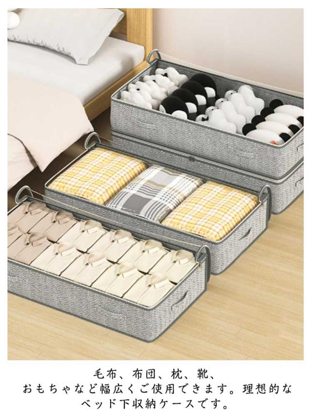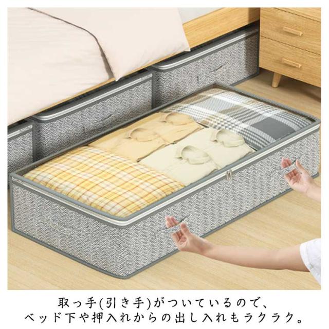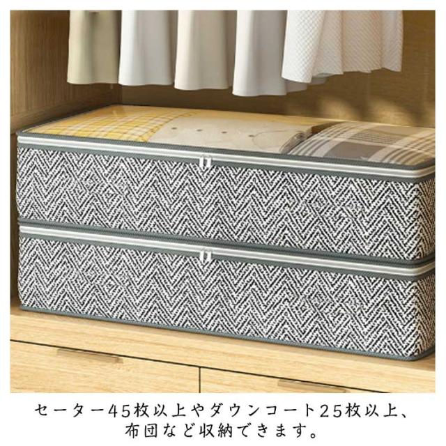 | スペースを有効活用・ベッド下収納ケース。 ベッド下のスペース、クローゼットの空きスペース、押入れの隙間などにピッタリな収納ケース。 セーター45枚以上やダウンコート25枚以上、布団など収納できます。 毛布、布団、枕、靴、おもちゃなど幅広くご使用できます。理想的なベッド下収納ケースです。 通気性の良い不織布で、オフシーズンの衣類や布団などを湿気やホコリから守り大切に保管できます。 取っ手(引き手)がついているので、ベッド下や押入れからの出し入れもラクラク。 透明窓からケースを開けずに中身が見えるので、収納物を探す手間が省けて効率的。 | |