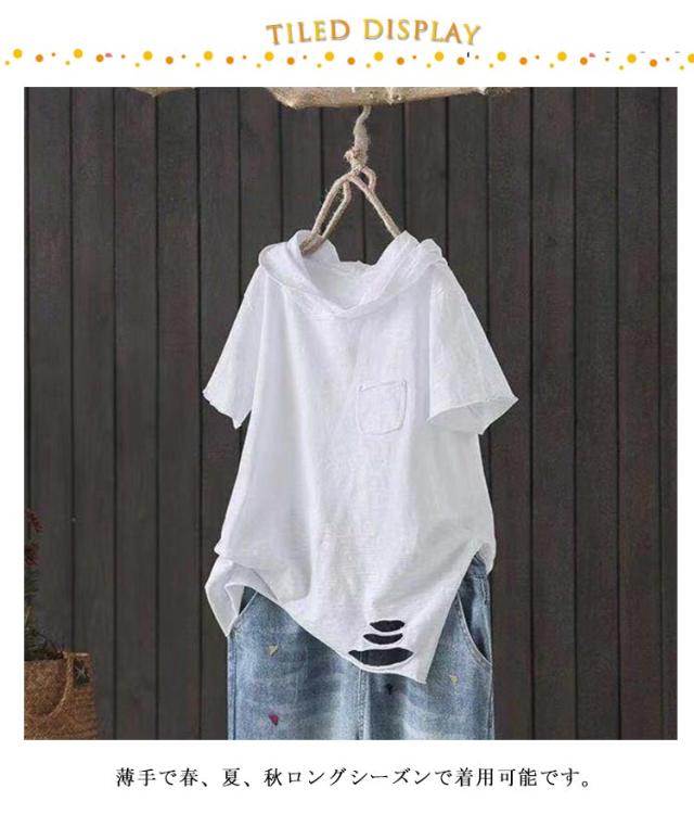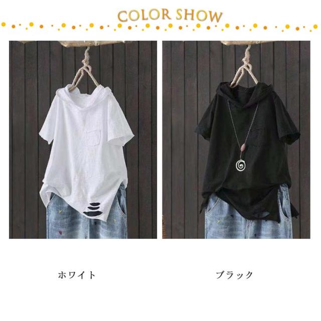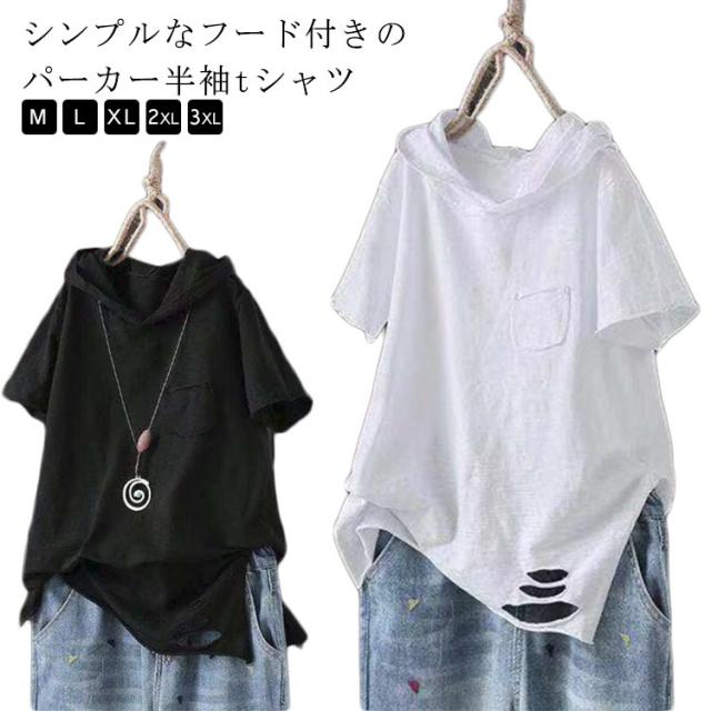半袖 tシャツ Tシャツ 夏服 春服 綿混 半袖tシャツ パーカー カットソー フード付き ロングtシャツ シンプル カジュアル ロングt 無地 レディース 薄手 パーカーtシャツ パーカ プルオーバー 半袖tシャツ ホワイト ブラック 黒 白 大人女性