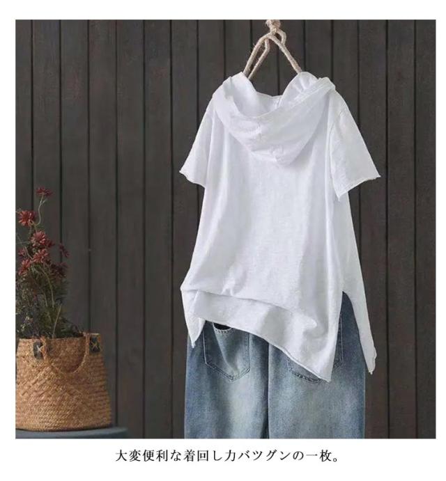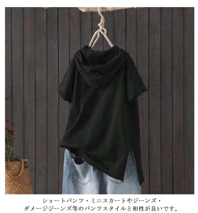 | シンプルなフード付きのパーカー半袖tシャツ 薄手で春、夏、秋ロングシーズンで着用可能です。 ふんわりゆるめの雰囲気が印象的な可愛いアイテムです。 大変便利な着回し力バツグンの一枚。 ショートパンツ・ミニスカートやジーンズ・ダメージジーンズ等のパンツスタイルと相性が良いです。 女性らしく可愛らしい雰囲気を醸し出し、シンプルな無地なのでなんでも合わせやすくコーディネートできます。 | |