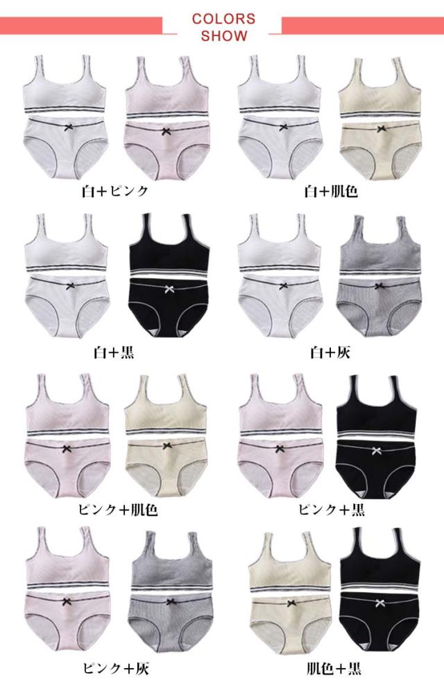 | 小学生高学年〜中学生向け女の子用下着上下セット 肌触りいい綿素材使用。 伸縮性のあるノンストレスな着心地! ファーストブラにおすすめ、パット入りなので安心! 修学旅行・水泳・スイミング・部活・体育やお泊り会におすすめのジュニア向けアウターセット。 | |