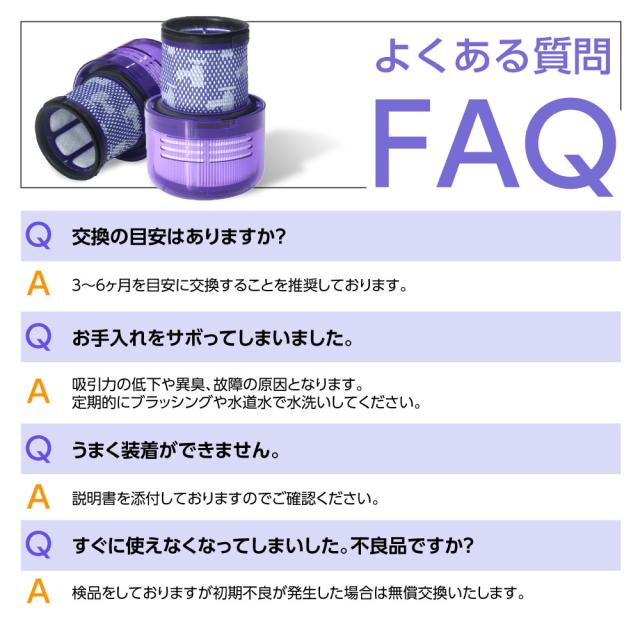 【対応機種】 970612-01互換(SV18 (DigitalSlim) ) ・Digital Slim Fluffy Origin (SV18 FF ENT) ・Digital Slim Fluffy (SV18 FF) ・Digital Slim Fluffy+ (SV18 FF COM) ・Digital Slim Fluffy Pro (SV18 FF PRO) ・Digital Slim Fluffy Origin (SV18 FF ENT2) ・Digital Slim Fluffy (SV18 FF EX) ・Digital Slim Fluffy Origin (SV18 FF ENT EX) ・Digital Slim+ (SV18 FF COM2) ・Digital Slim Fluffy (SV18 FF N) ・Digital Slim (Black, SV18 FF BK) ・Digital Slim Fluffy Origin (SV18 FF ENT N) ・Digital Slim Fluffy Origin Purple 【純正品と遜色ない性能】 微細な粒子や不快なニオイを効果的に除去し、清潔で快適な室内環境を提供します。 厳格な品質管理により製造され、確かな性能と信頼性をお約束します。 【99.97%の微粒子をキャッチ】 高性能HEPAフィルターが0.3ミクロンの超微細粒子を99.97%以上をキャッチ。 クリーンで健康的な生活空間を提供します。 日常の家庭内汚染物質を効果的に除去し、空気を清潔に保ちます。 【アレルギー対策に最適】 アレルゲンや微細なダストに対応したHEPAフィルターは、アレルギー体質の方にも安心です。 花粉、ペットのフケ、ダニの排泄物など、アレルギーの原因となる粒子を確実に捕らえ、室内環境を清潔に保ちます。 【水洗い可能で清潔】 繰り返し水洗いが可能なため、経済的かつ環境に優しいです。 定期的な水洗いによりフィルターの性能を維持し、長期間にわたり清潔な空気で生活ができます。 簡単な手入れで常に最高の性能を発揮します。 【水洗い時の注意点】 十分に乾いたことを確認してから掃除機に取り付けしてください。 カビや臭い、掃除機故障の原因となります。 【交換目安】 3〜6ヶ月での交換を推奨します。 臭いがとれない、音が大きい、掃除機の性能が落ちた気がするなどが確認できたら交換サインです。 【パッケージ内容】 SV18 (DigitalSlim) 対応フィルター、専用ブラシ×1。 【アフターサービス】 厳格な品質検査を複数回実施し、品質には万全を期しています。 万が一の不良品による返品・交換も迅速に対応いたしますので、ご連絡ください。 |