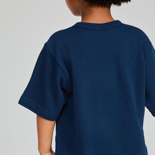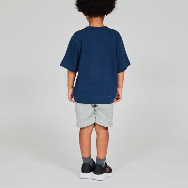 KIDS SHORT SLEEVE SWEATSHIRT 25SS 環境に配慮して生産されたサステナブルなアメリカ綿60%、ポリエステル40%による薄手の裏毛素材を使用した、キッズ用ショートスリーブスウェットシャツ。