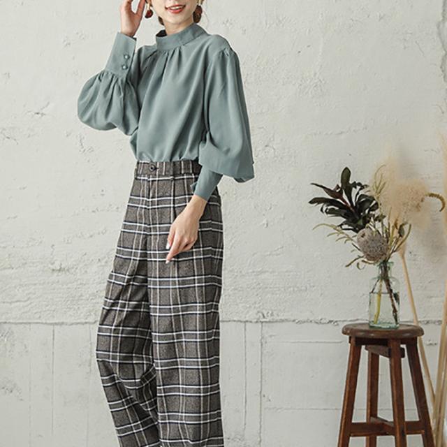 高めなネックにギャザーを入れて上品さを演出。