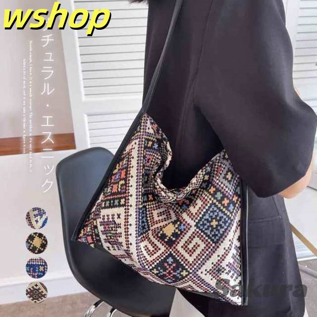 【wshop 】ニットバッグ 編みバッグ レディース 肩掛け トートバッグ ショルダーバッグ 斜め掛け 総柄 軽量 エスニック 布バッグ 旅行 柔らかい かばん バッグ キャンバス 布製 軽い 便利 おしゃれ かわいい ナチュラル カジュアル お出かけ 母の日 送料無料