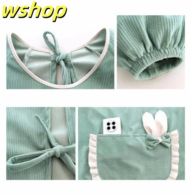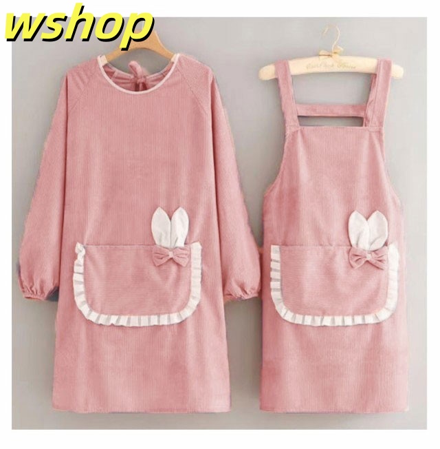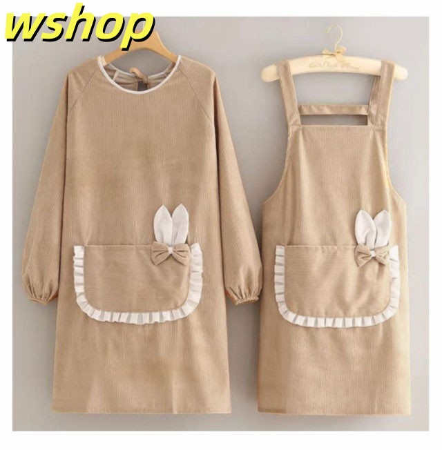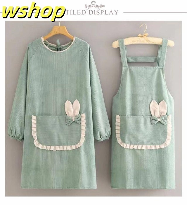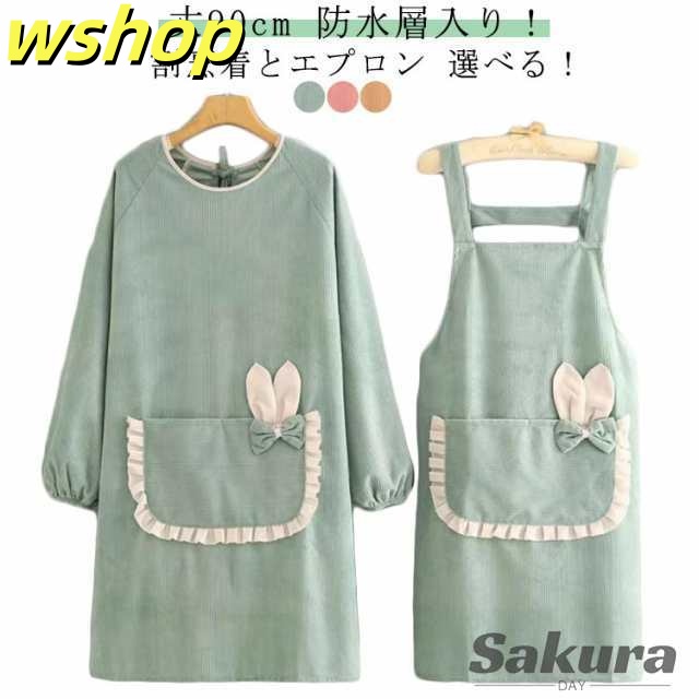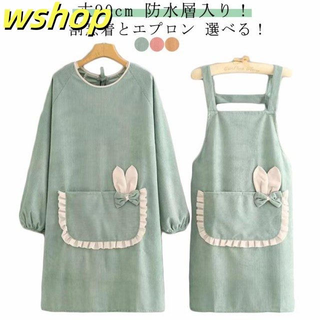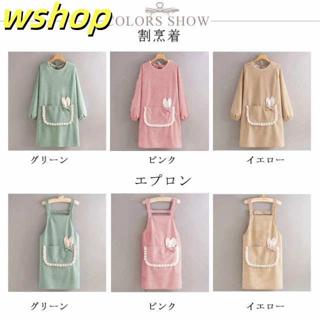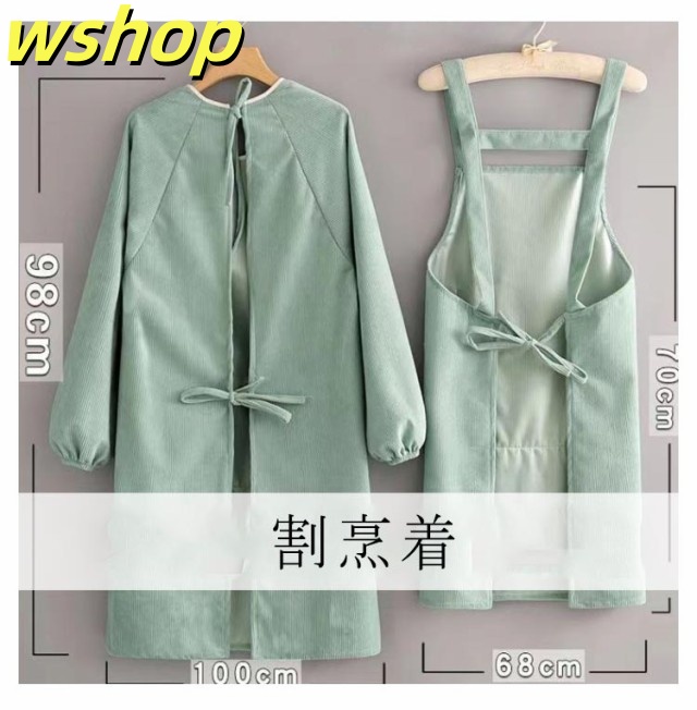 【wshop 】割烹着 コーデュロイ 暖かい エプロン かっぽう着 割烹着 コーデュロイ 長袖 袖ゴム入り かわいい おしゃれ くすみカラー ワンピース チュニック あったか 無地 ゆったり 袖あり グリーン ピンク イエロー 結婚祝い おしり隠れる 母の日 敬老の日 プレゼント ギフト