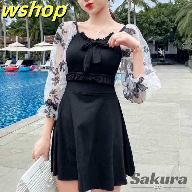 夏新作新レディース水着ワンピース水着体型カバー刺繍入り無地着やせ可愛い上質プチプラ長袖海プール
