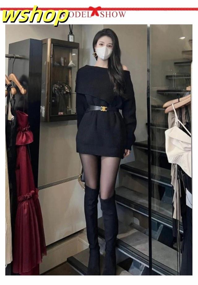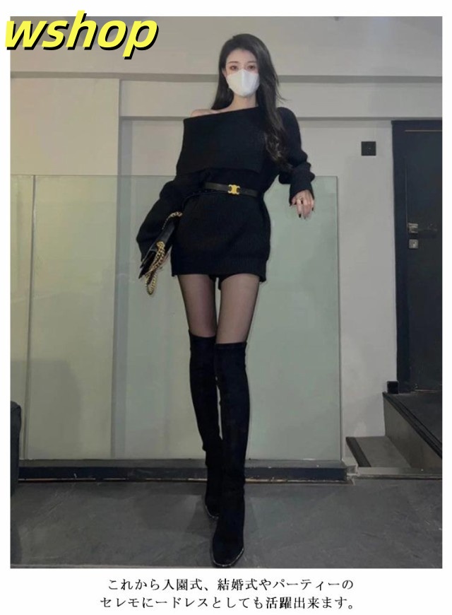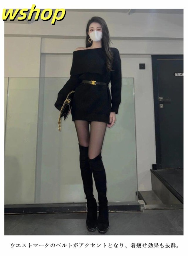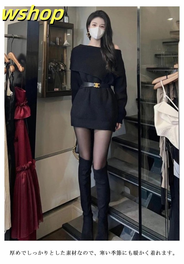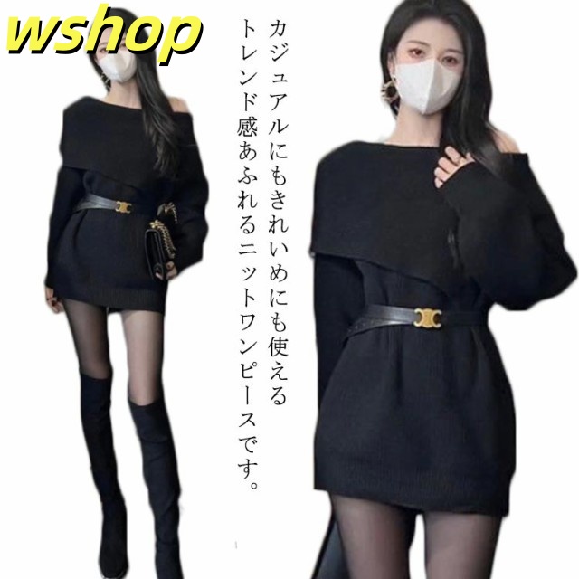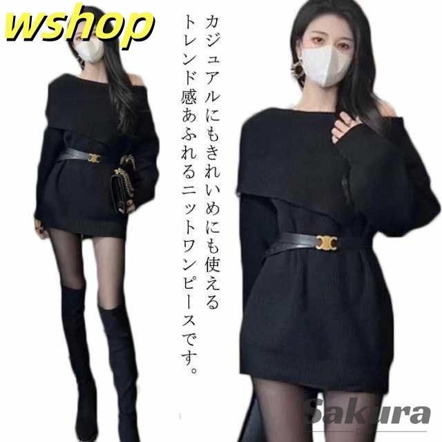 ベルト付き 春秋冬 オフショルダー 長袖 レディース ショート丈 ワンピース ワンピース ゆったり オフショルダー セクシー チュニック 肩出し きれいめ 二次会 ニットワンピース